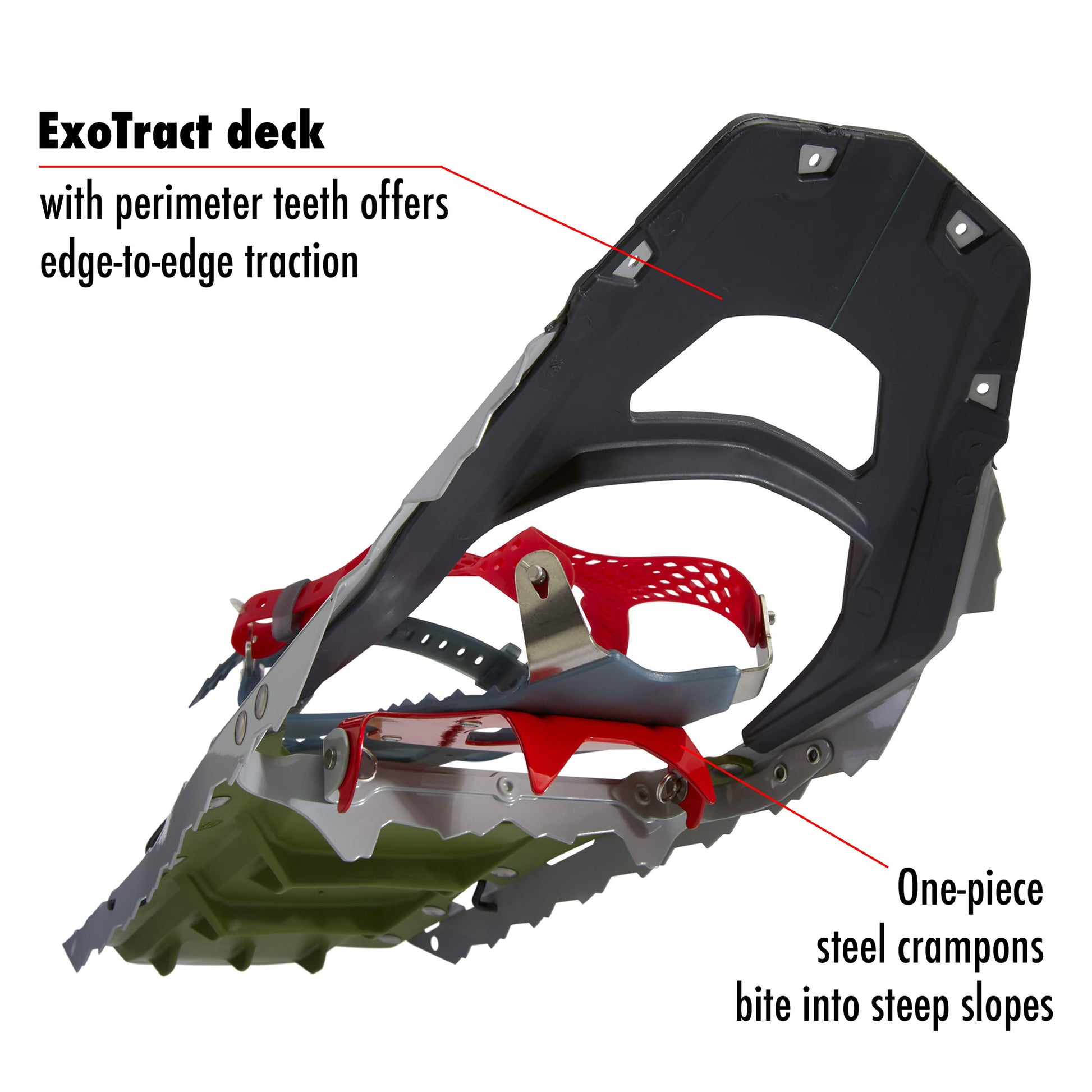 - Perimeter teeth of injection-molded ExoTract deck offer edge-to-edge traction, while one-piece steel crampons provide bite on traverses and steep slopes