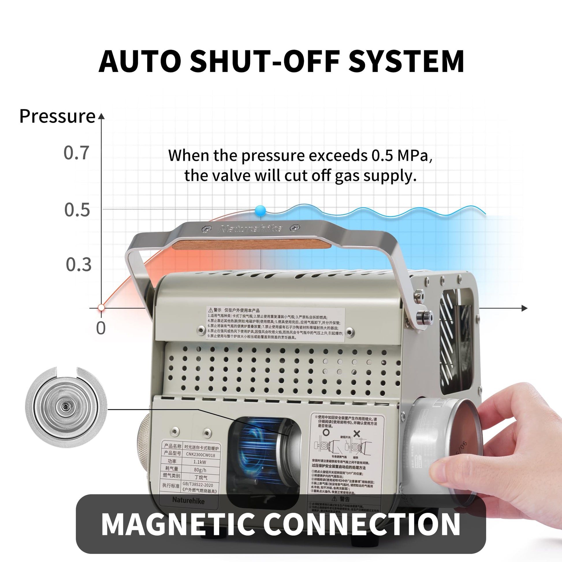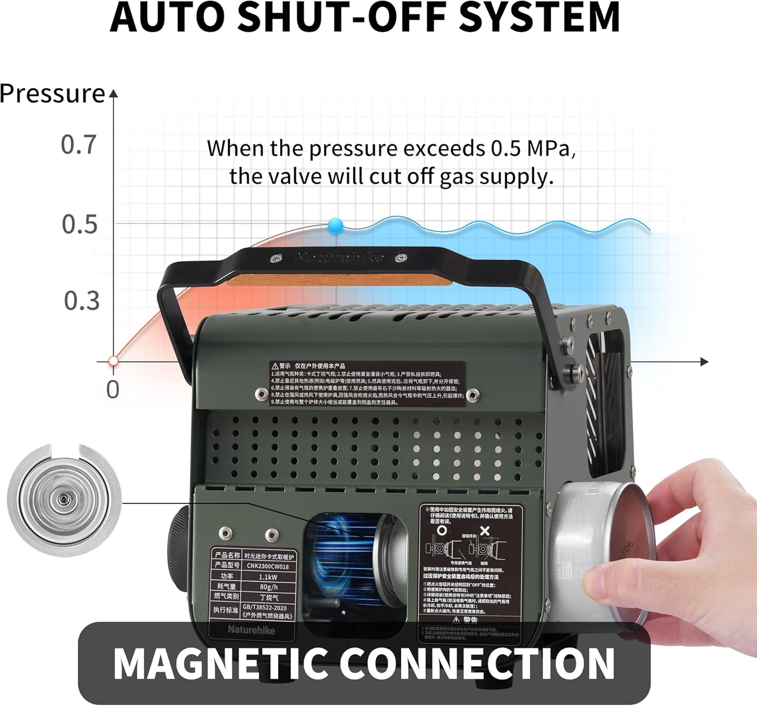 - Easy to Use: Featuring a magnetic connection and an automatic gas shutoff for overpressure, our camping heater is simple and safe to operate, even for beginners.