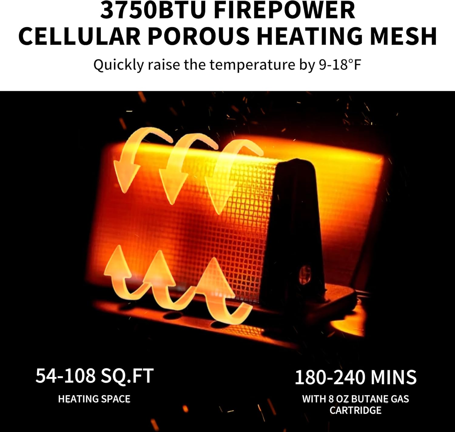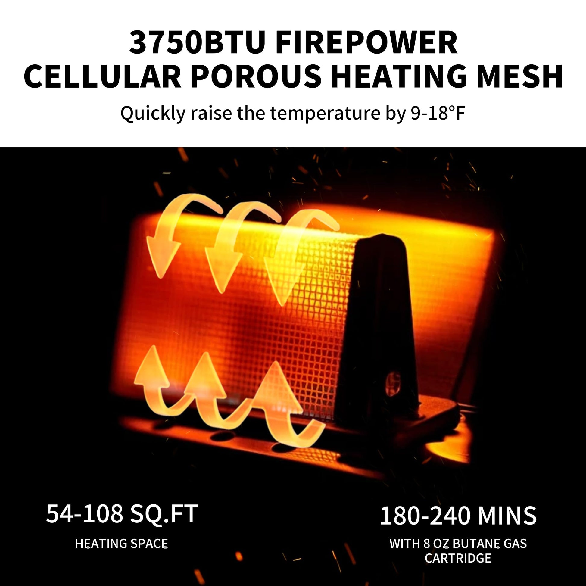 - Powerful Heating: With a 3750 BTU firepower and efficient cellular porous mesh heating technology, this butane-powered camping stove heater can warm an area from 54-108 square feet in just minutes.