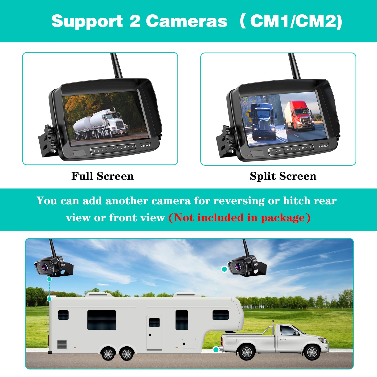 - 🚚🚚 IR Night Vision & Split Screen - The lumen rating is 0.01 at low light night, giving you an extraordinary visual experience with colorful images. You can still watch 60 feet vision even in a dark environment. This system supports 2 cameras, press "C" button to switch for Cam1/Cam2 or both cameras. (Please kindly note that the second wireless camera need to purchase separately)