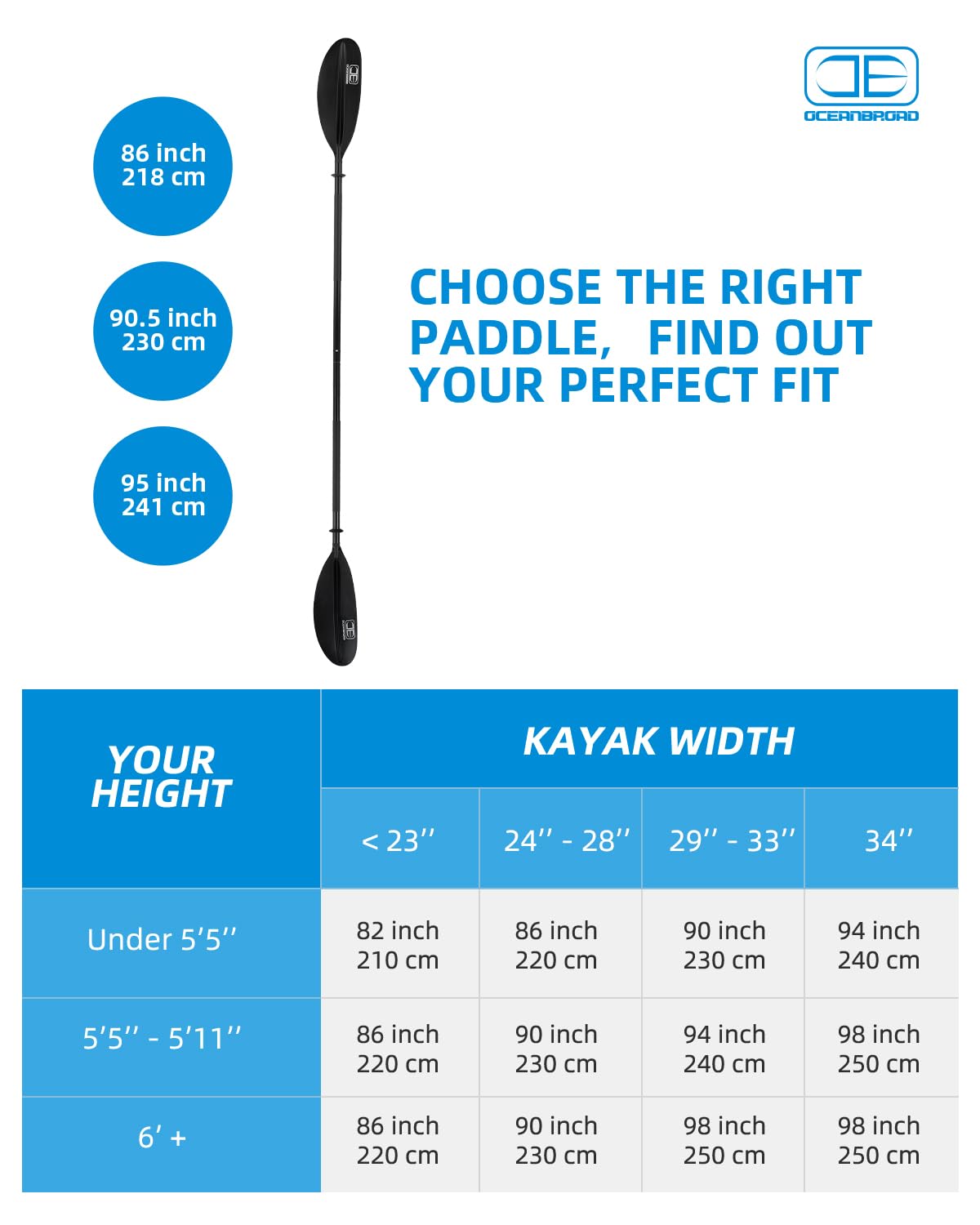 - POPULAR LENGTH AT 230CM: Not too short, not too long, the oar is 230cm (90.5 inches) at length. It’s an ideal kayak paddle with moderate length for you and your family. It’s also detachable at 2 sections, so you might carry it around and put it away easily.