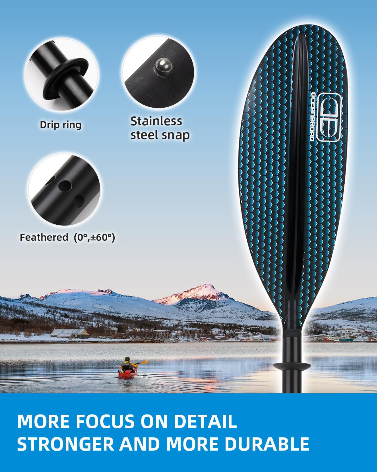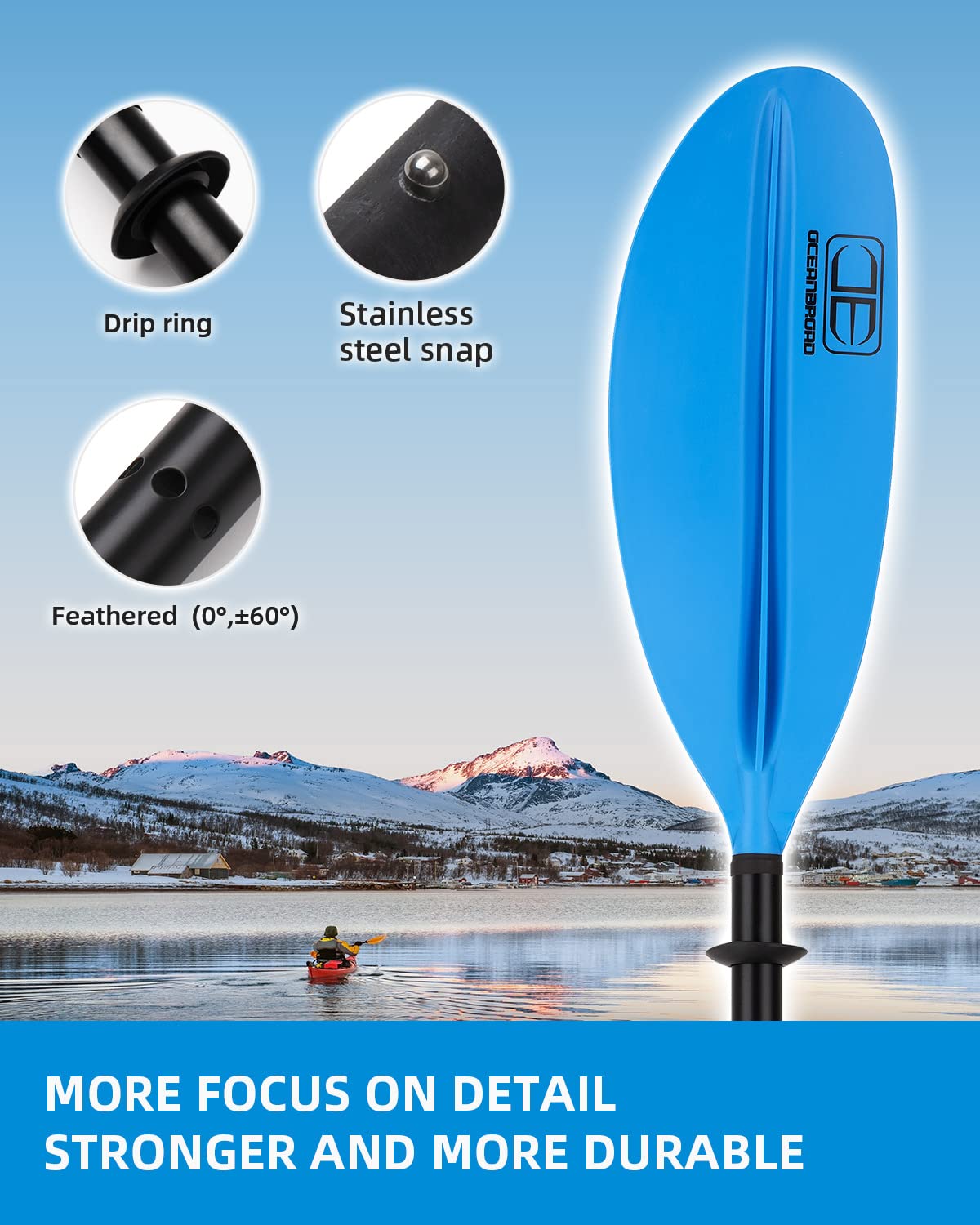 - LEASH/3 ANGLES/ DRIP RINGS: All OCEANBROAD kayak paddles come with a bungee paddle leash. It helps secure your paddle to your kayak, especially when you want to lay down the oars, stop by a little bit to enjoy great views around. The paddle is with 3 locking positions for different kayaking angle preference. The drip rings at two ends help stop water flowing from the blades. So, the shaft and your hands won’t get wet easily.