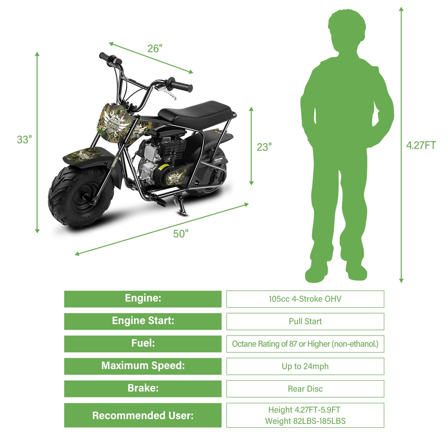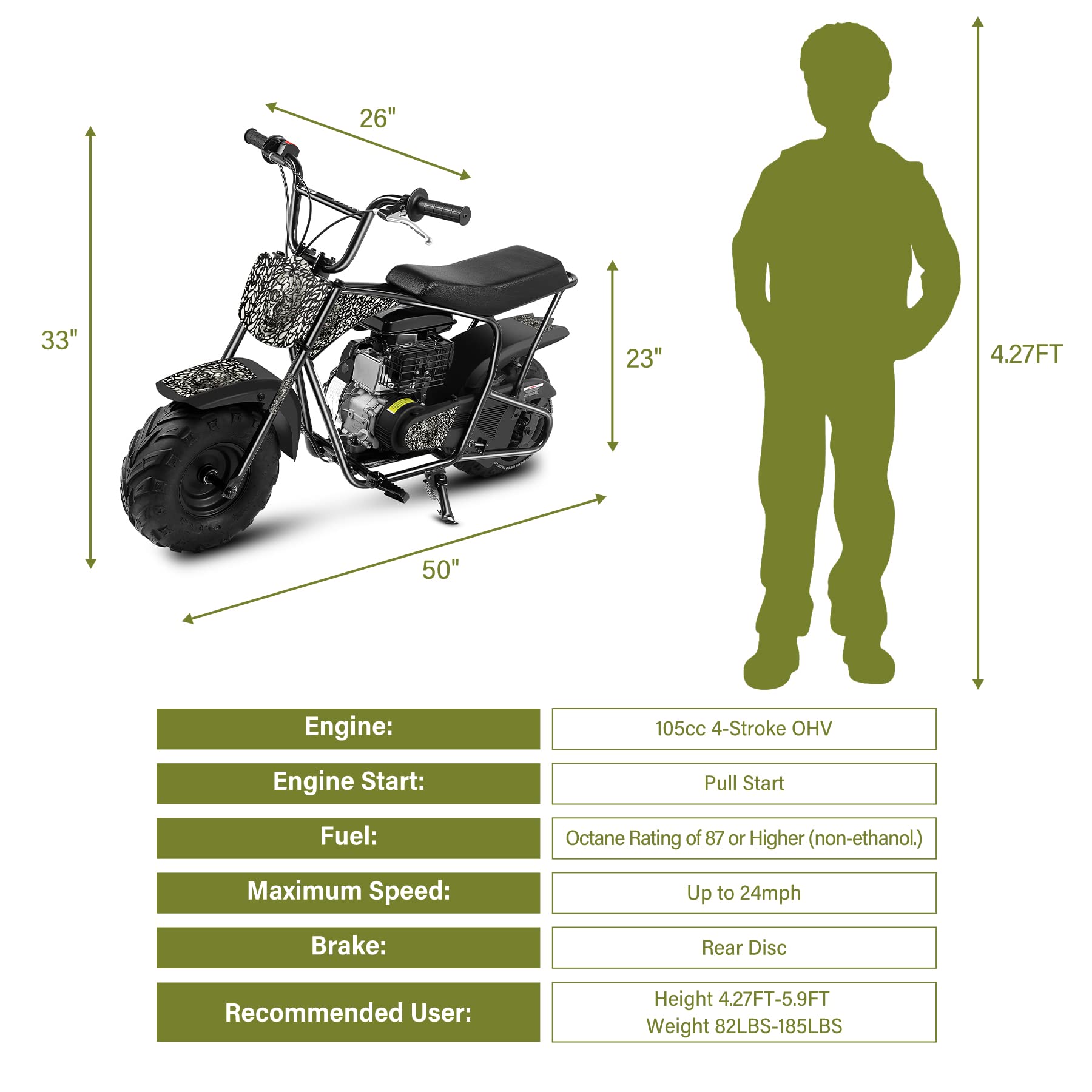- 【DURABLE & RELIABLE, SAFETY FIRST】 kids mini dirt bikes have durable clutch & stable, sturdy metal frame, long-running time. The rear disc brake provides smooth and fast when braking. Max speed of 24 Mph, tank capacity 0.32-gallons. The 105cc 4-stroke engine has higher stability, longer life and lower failure rate, and we have a fully automatic chain transmission system