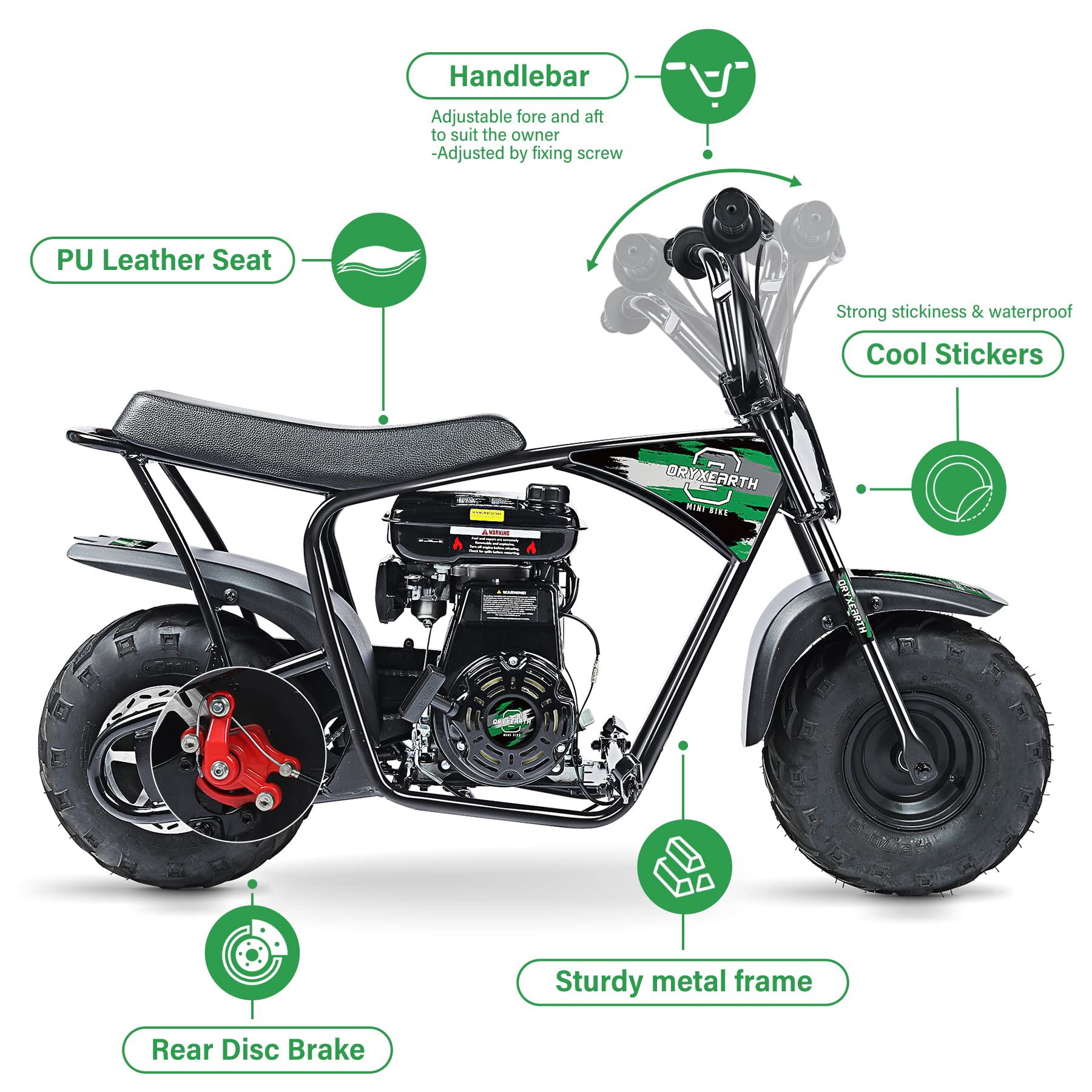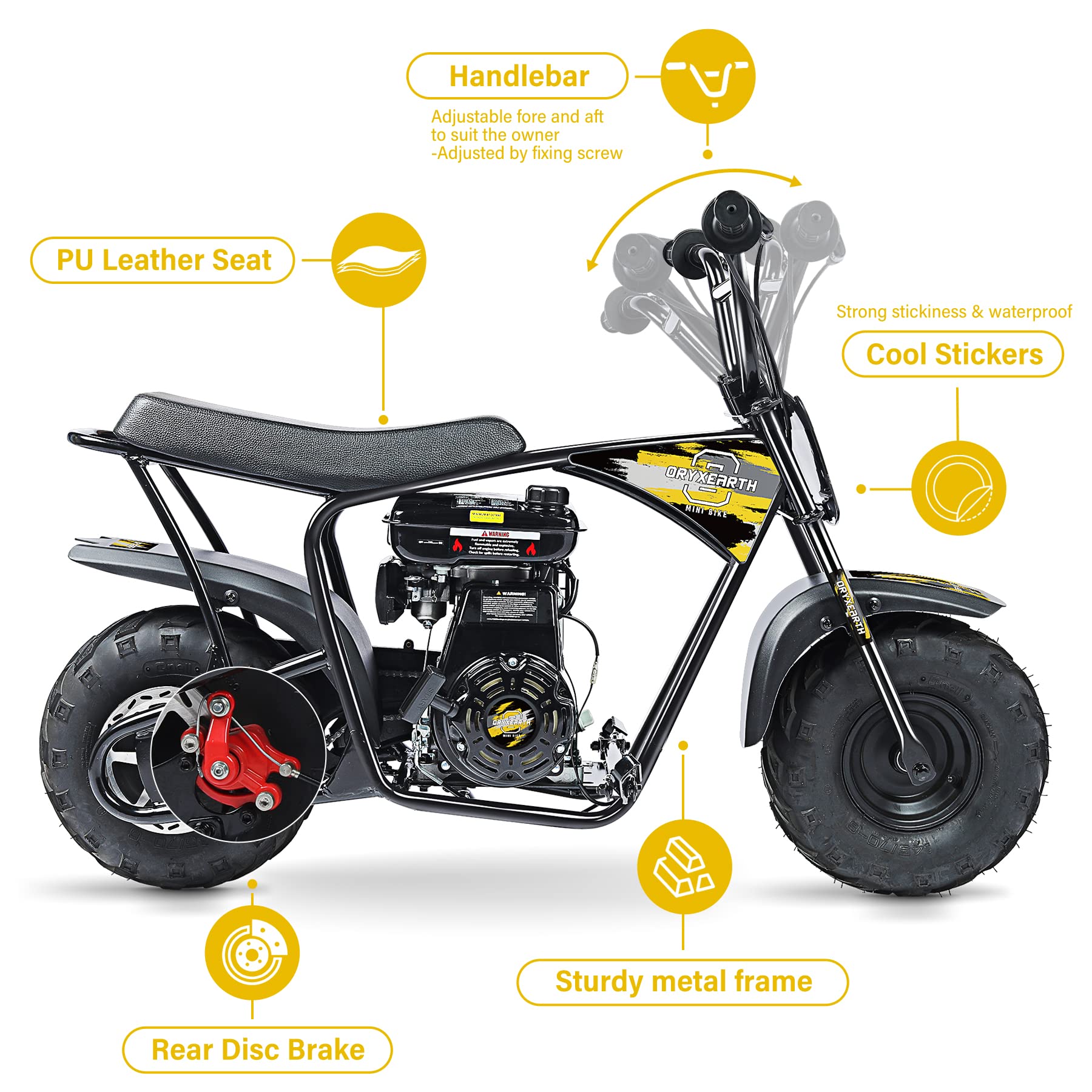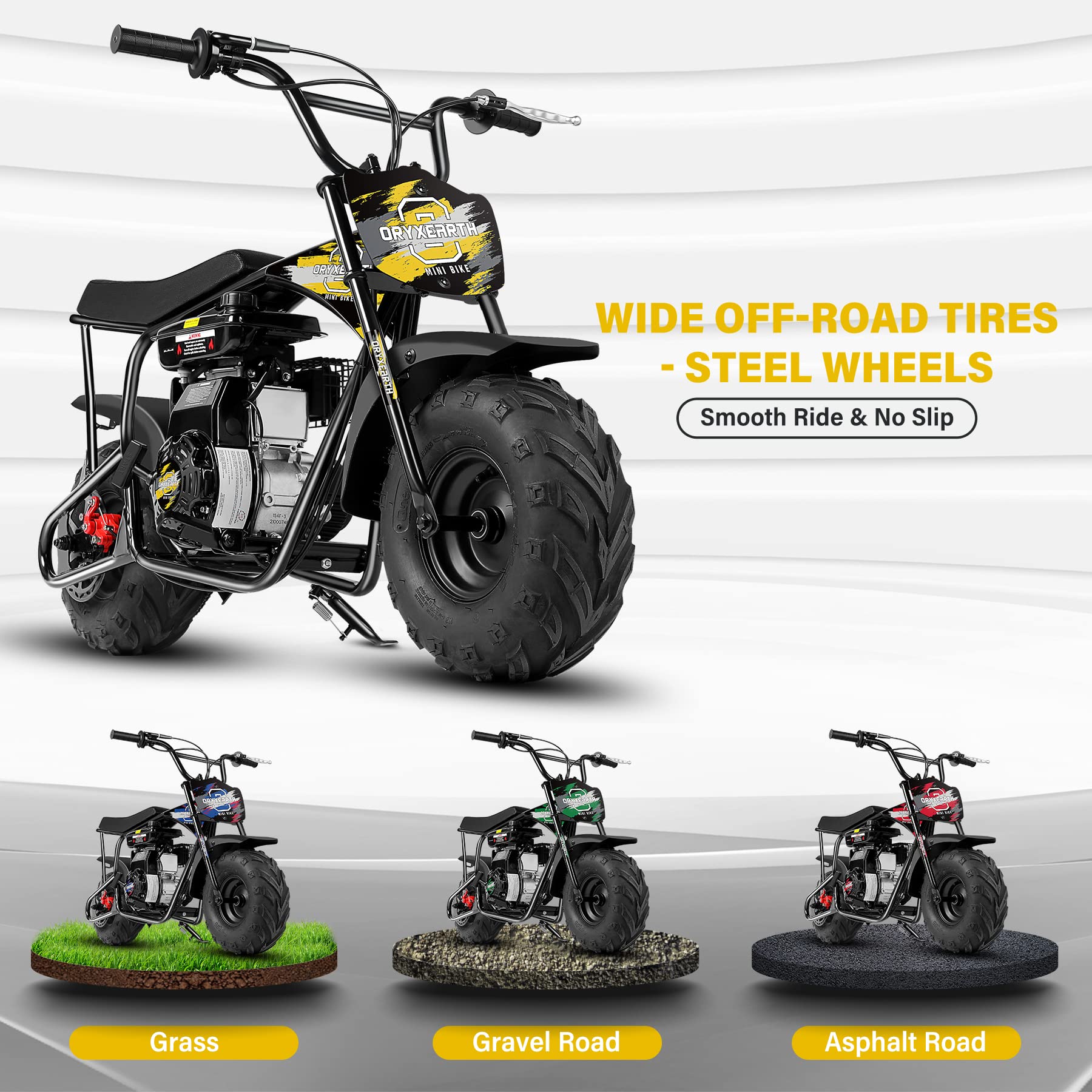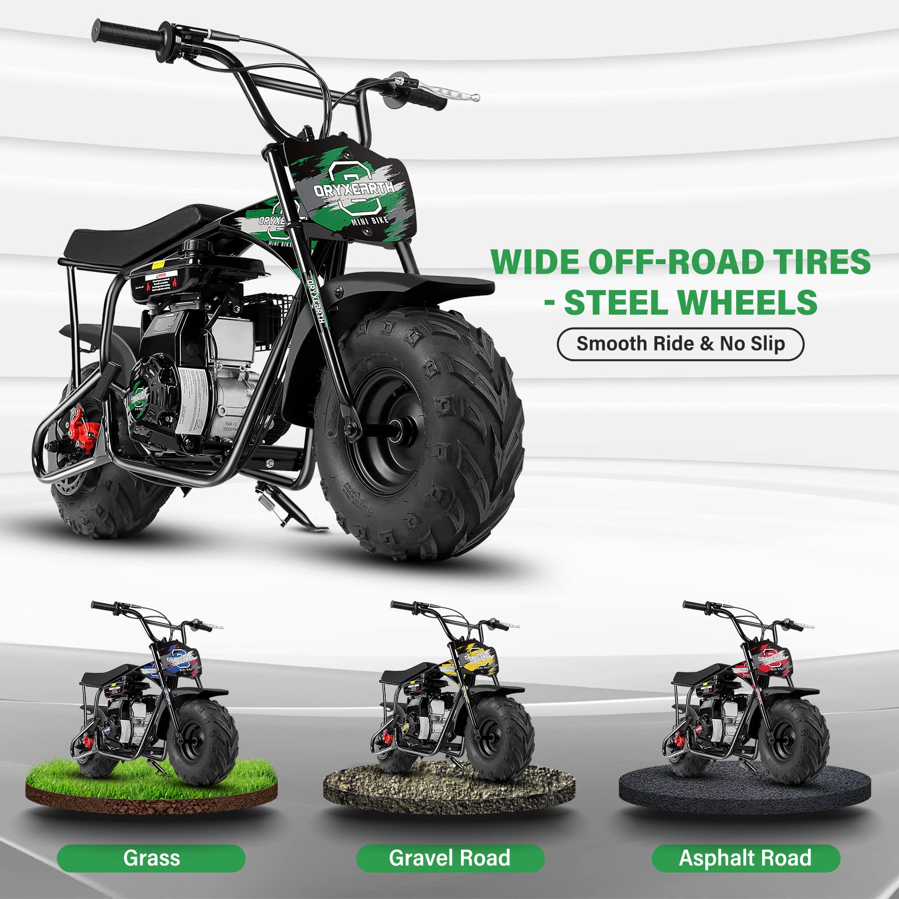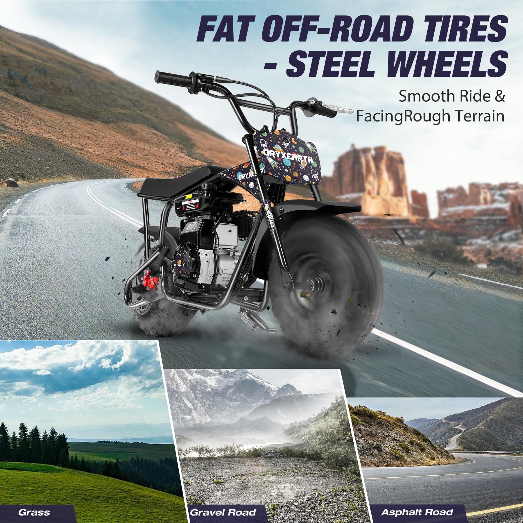 - 【EASY & SMOOTH & SOFT & STABLE】The Oryxearth Gas powered bike is set up for easy pull-start operation, making it the ideal off-road kids mini gas bike for teen/kids riders. Stability is important off-road. To give you a soft, smooth ride, we are equipped with wide, off-road low pressure pneumatic tires, even facing rough terrain