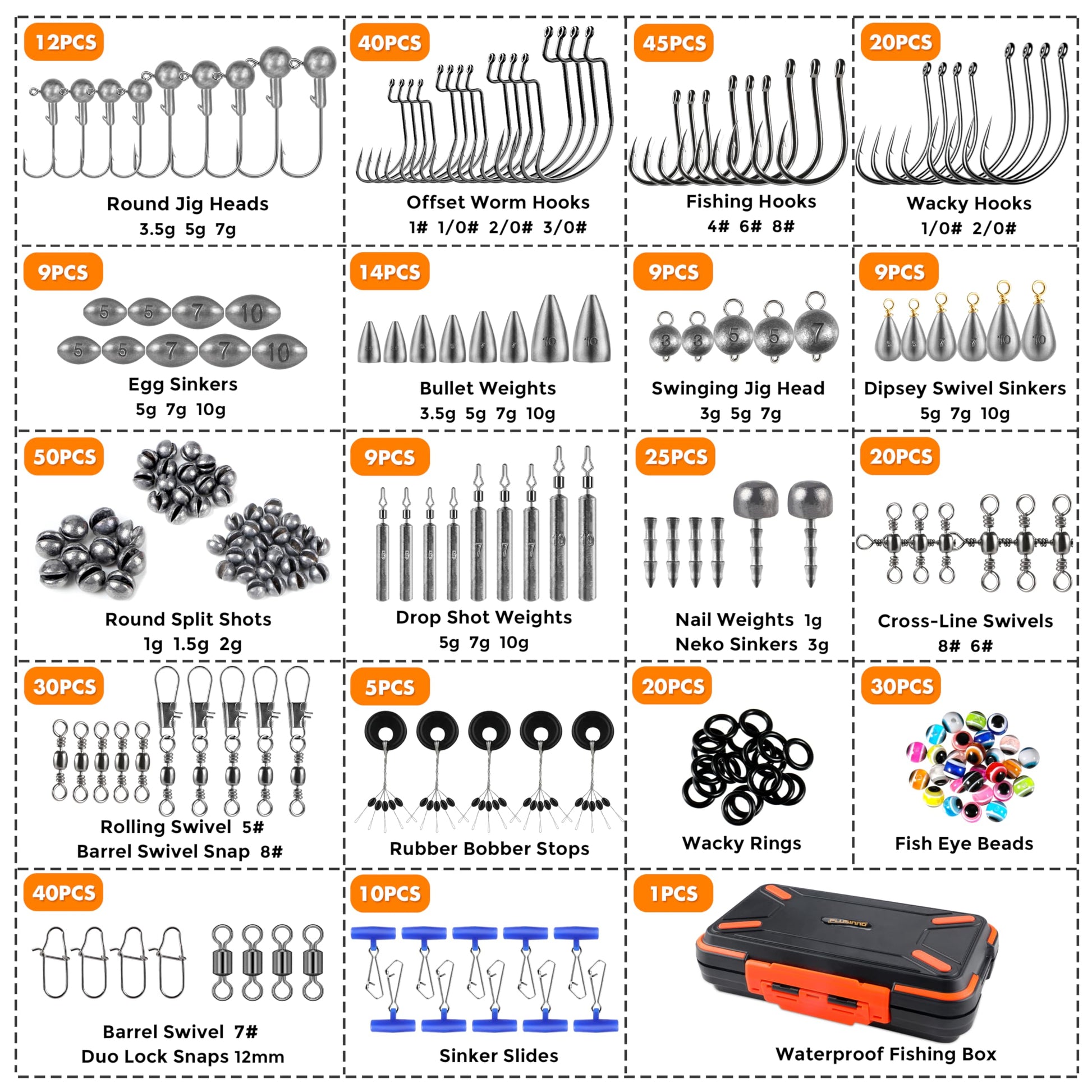 - 【Complete Fishing Tackle Kit】- PLUSINNO 397pcs fishing gear is loaded with 12 fishing rigs for fishing enthusiasts and beginners. It collects nearly all fishing accessories including Fishing Hooks, Round Jig Heads, Round Split Shot, Egg Sinker, Dipsey Swivel Sinker, Drop Shot Weights, Bullet Weights, Nail Weights, Neko Sinkers, Fishing Snap, 4 kinds of different Fishing Swivels, Fishing Sinker Slider, Fish Eye Beads, Wacky Rings and Bobber Stops
