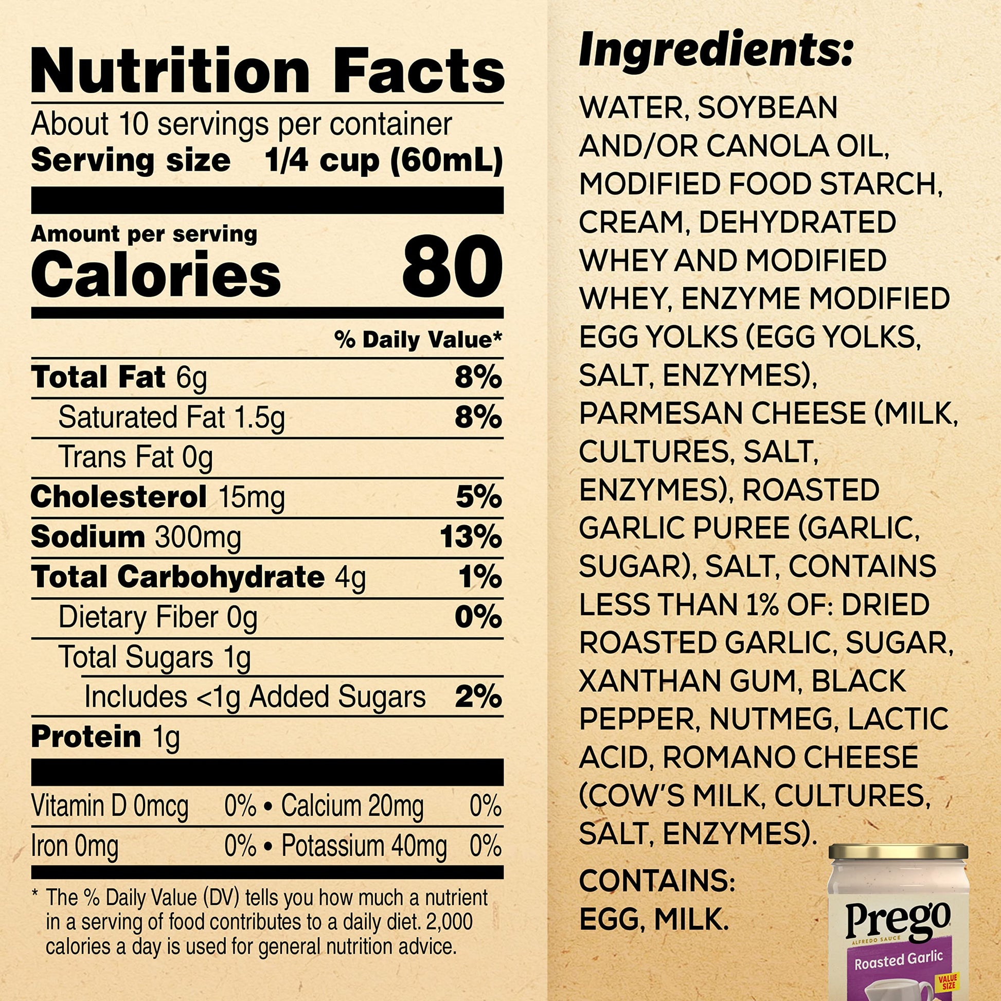 Prego Roasted Garlic Parmesan Alfredo Sauce has the ideal balance of fresh cream, Parmesan cheese and sweet, roasted garlic for a silky, smooth flavor. Your family will love the indulgent touch this Alfredo brings to pasta or to your own family-pleasing recipes.