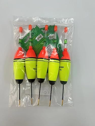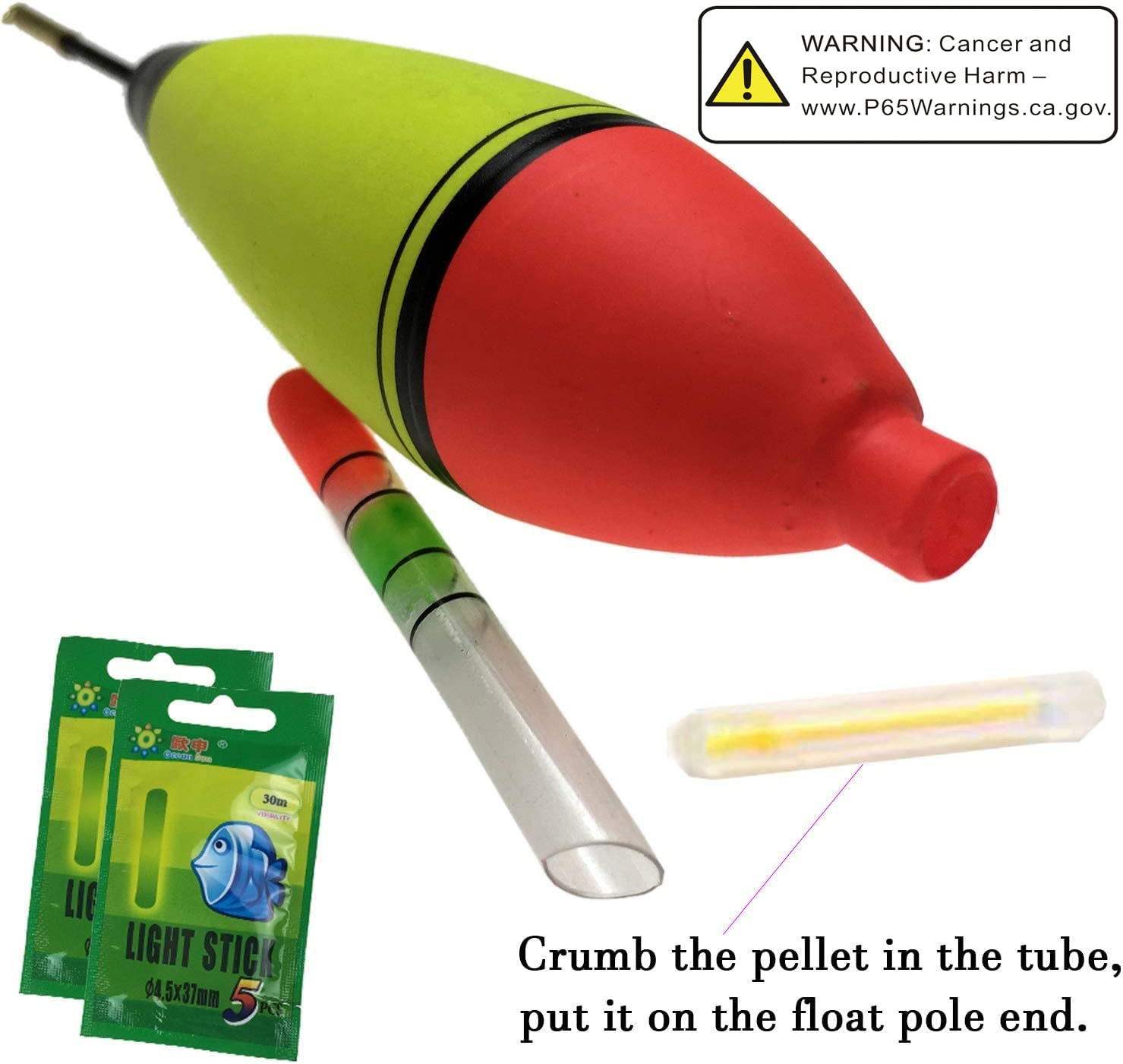 - 5. SPECIFICATION: Come with 2pack glow sticks, so the bobbers can be used at day and night fishing. Glow stick size: 4.5x37mm. Pakage included: 5 Pcs Fishing Bobbers + 2pack glow sticks.