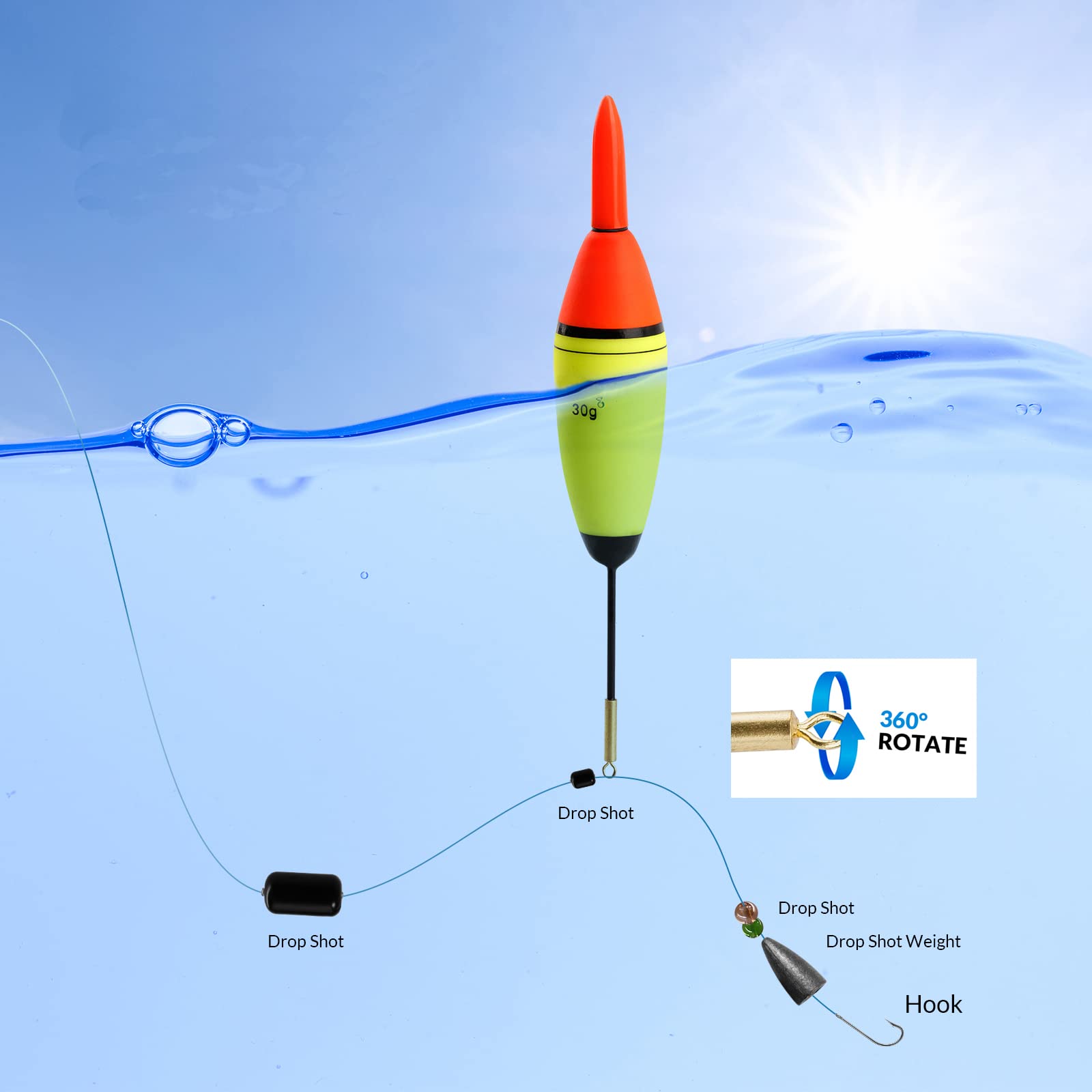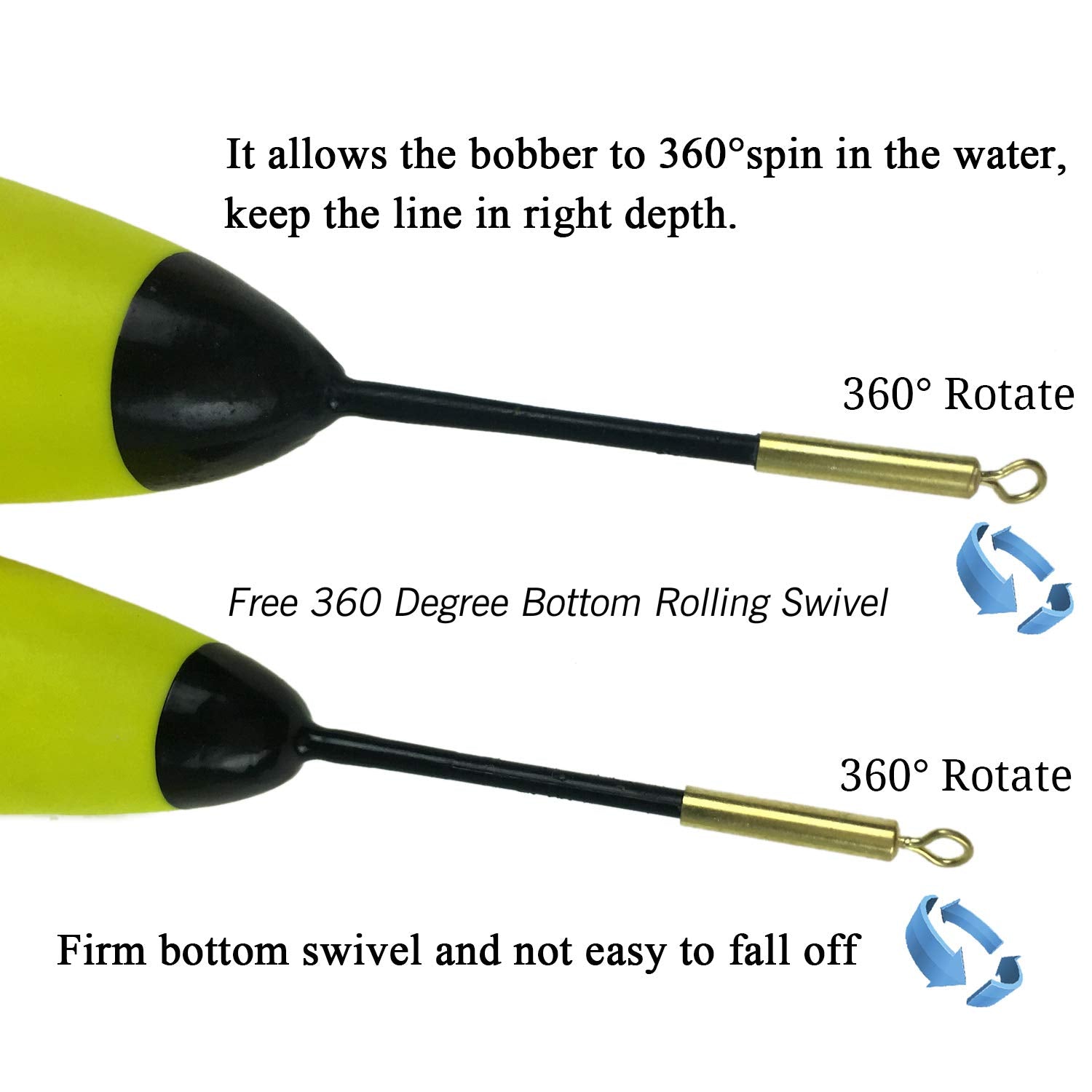 - 3. SENSITIVE FISHING FLOAT: These Floats have large buoyant, 3 buoyancy to choose: 10g(3/8oz), 20g(3/4oz), 30g(1oz). The float featured a 360 degree bottom rolling swivel, it allows the bobber to 360 degree spin in the water, keep the line in right depth. They work great as slip bobbers.