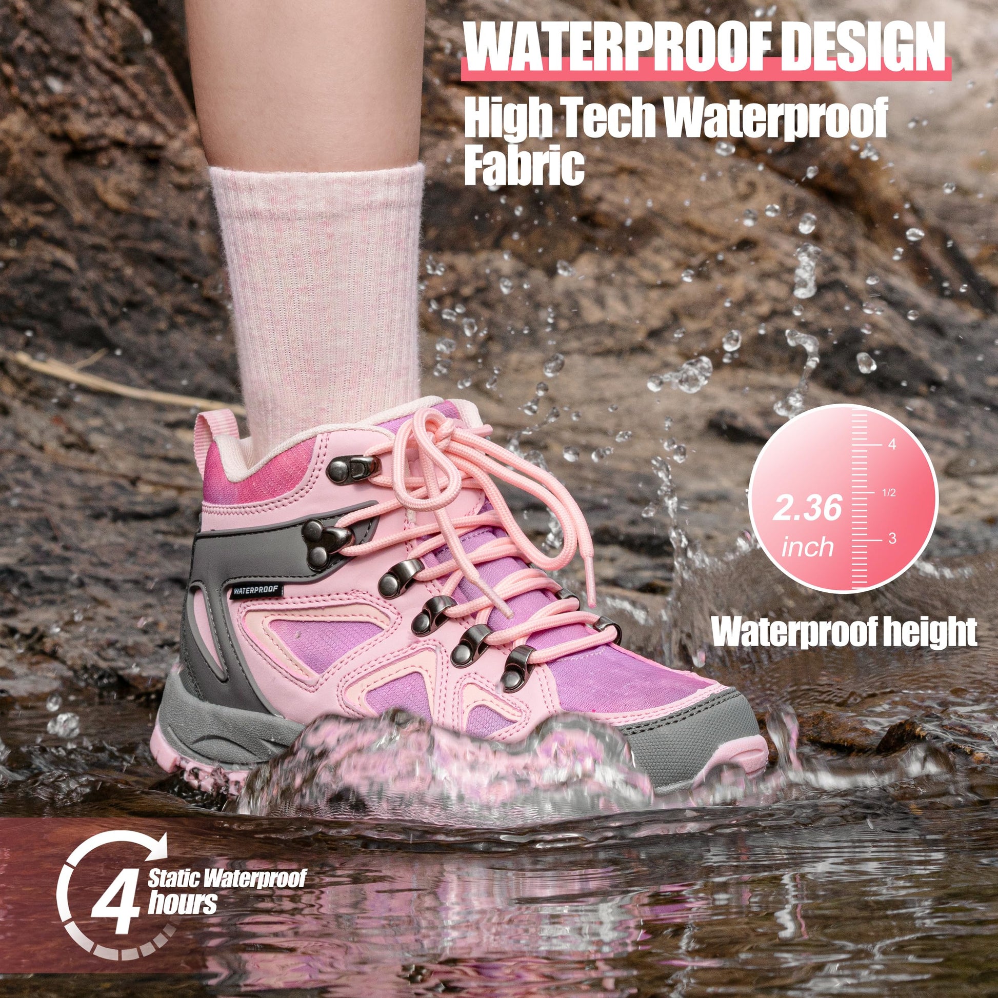 - Waterproof & Breathable:The high-grade waterproof fabric made through many tests and improvements is used, keep your kids' feet dry and comfortable in any weather.Soft insoles and breathable comfy lining wear can keeps your child's feet comfortable walk outdoors, play, hike, climb all the day.