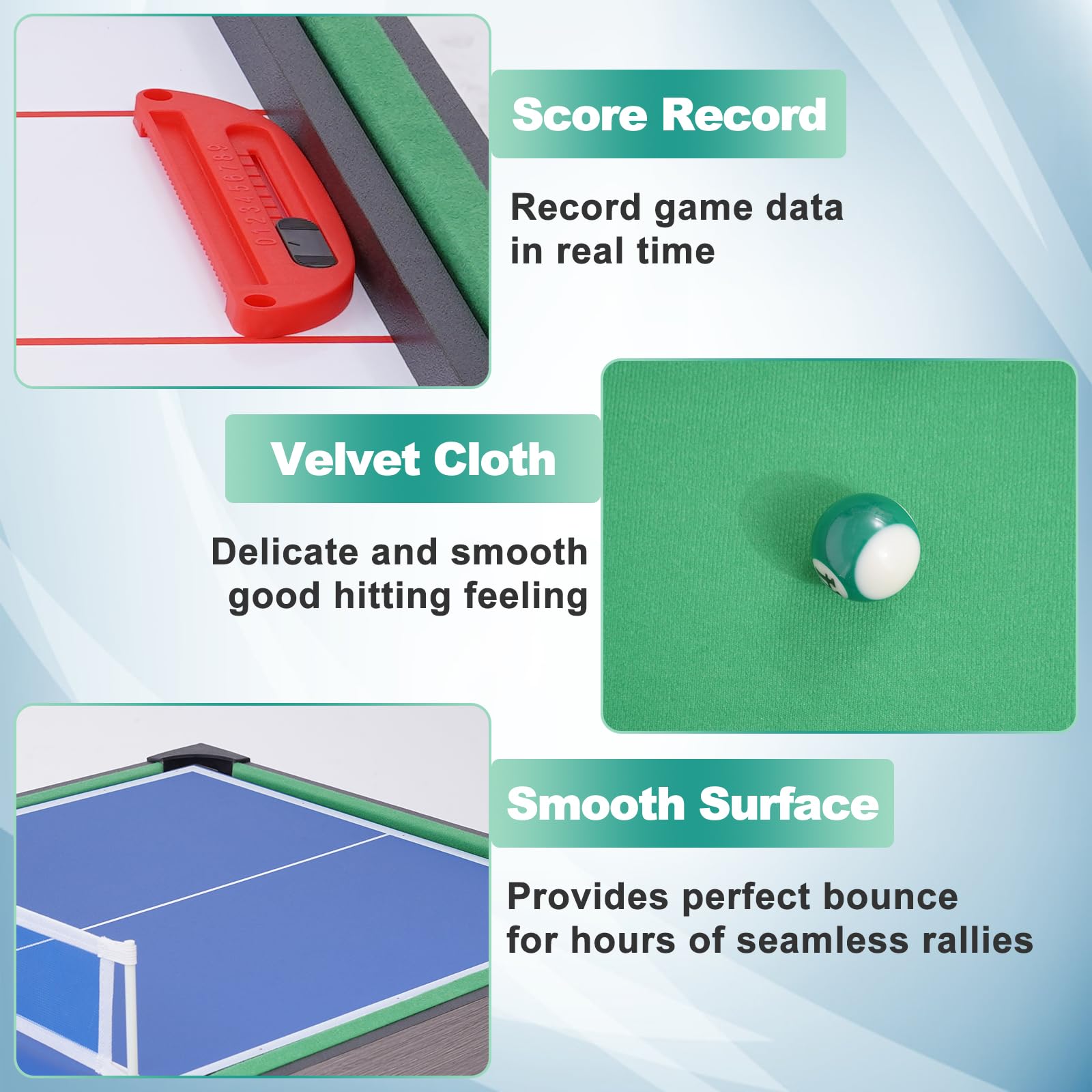 - Realistic Gaming Experience: RAYKEEP combination game tables bring you an immersive gaming experience. Comes with realistic players, a scoreboard, and comfortable handles. At the same time, the durable billiard felt, convenient collection ball net bag, and tabletop competition pattern also make the game real, tense, and fun