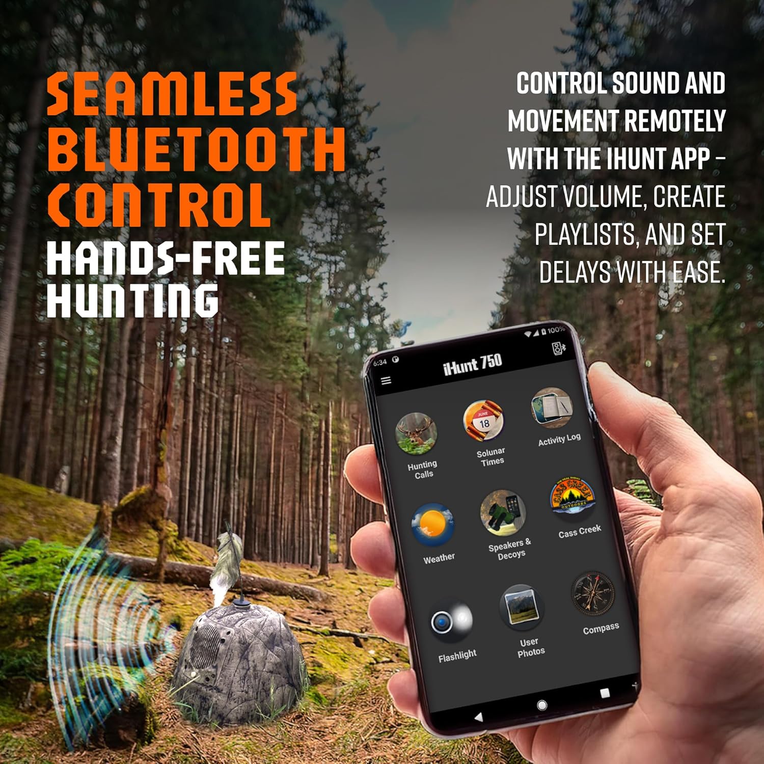 - BLUETOOTH REMOTE CONTROL: Control sound and decoy movement directly from your smartphone using the iHunt app; create custom playlists, set delays, and easily adjust volume for a hands-free hunting experience.