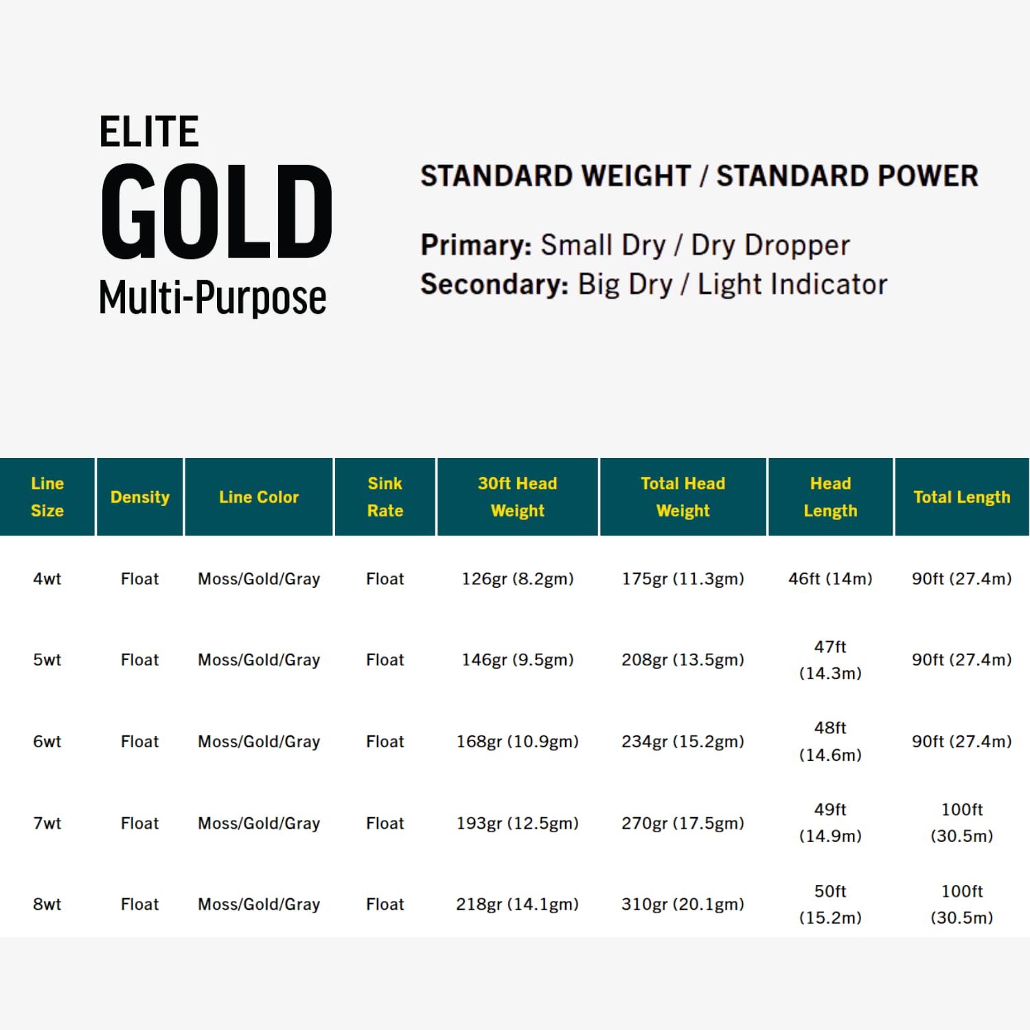 - ELITE GOLD: The Elite RIO Gold has a taper design that gives incredible loop stability at distance and a front taper that delivers perfect presentation of flies between sizes #2 and #22. With a long head and back taper this line is an excellent all around fly line on rivers and lakes when long casts and complete line control are required.