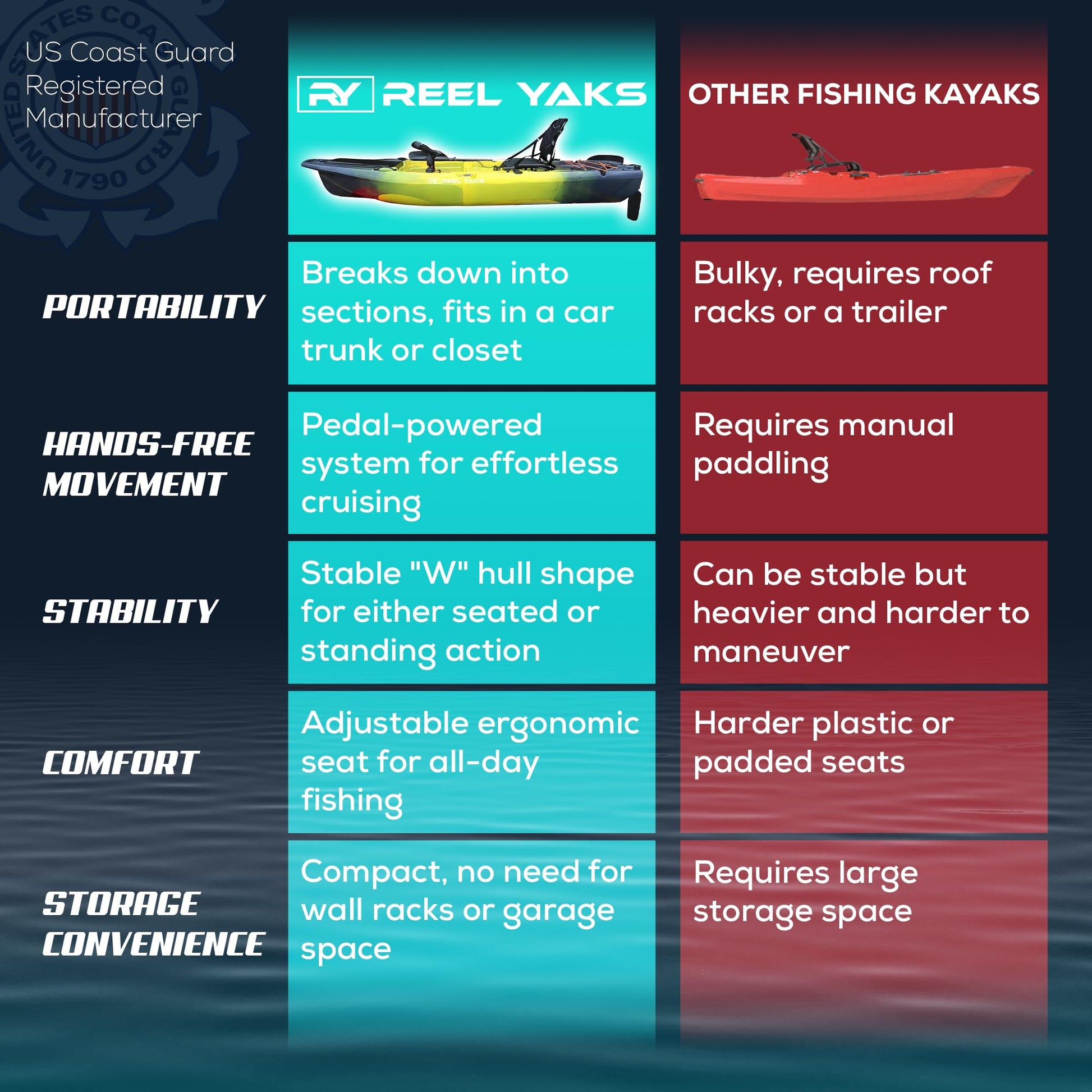 - LIGHTWEIGHT & TRANSPORTABLE: Each 39-lb section has built-in handles for easy carrying. Even those with back troubles can easily transport our fishing kayak with pedals to their favorite fishing spots. No roof racks or trailers needed. Despite its lightweight build, Reel Yaks are sturdy and stable!