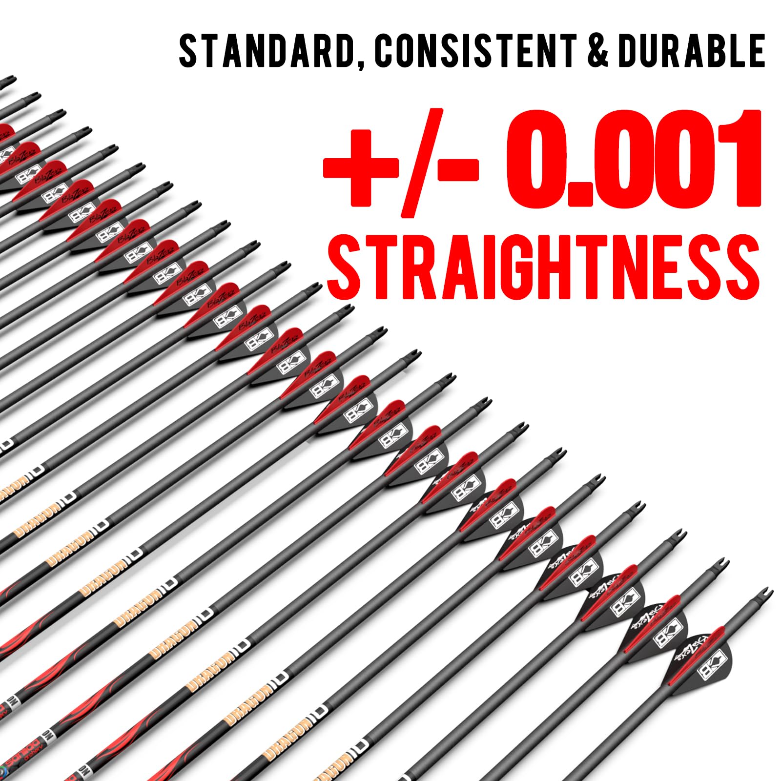 - 【Straightness: +/-0.006】 Dare to say the standard of Straightness: +/-0.006! Unlike the other brands who don’t note the straightness, definitely their arrows can’t be reached to +/- 0.006. Length: 32", Outer diameter: 0.281-0.299’’. For draw weight up to 75 pounds compound bows and recurve bows.
