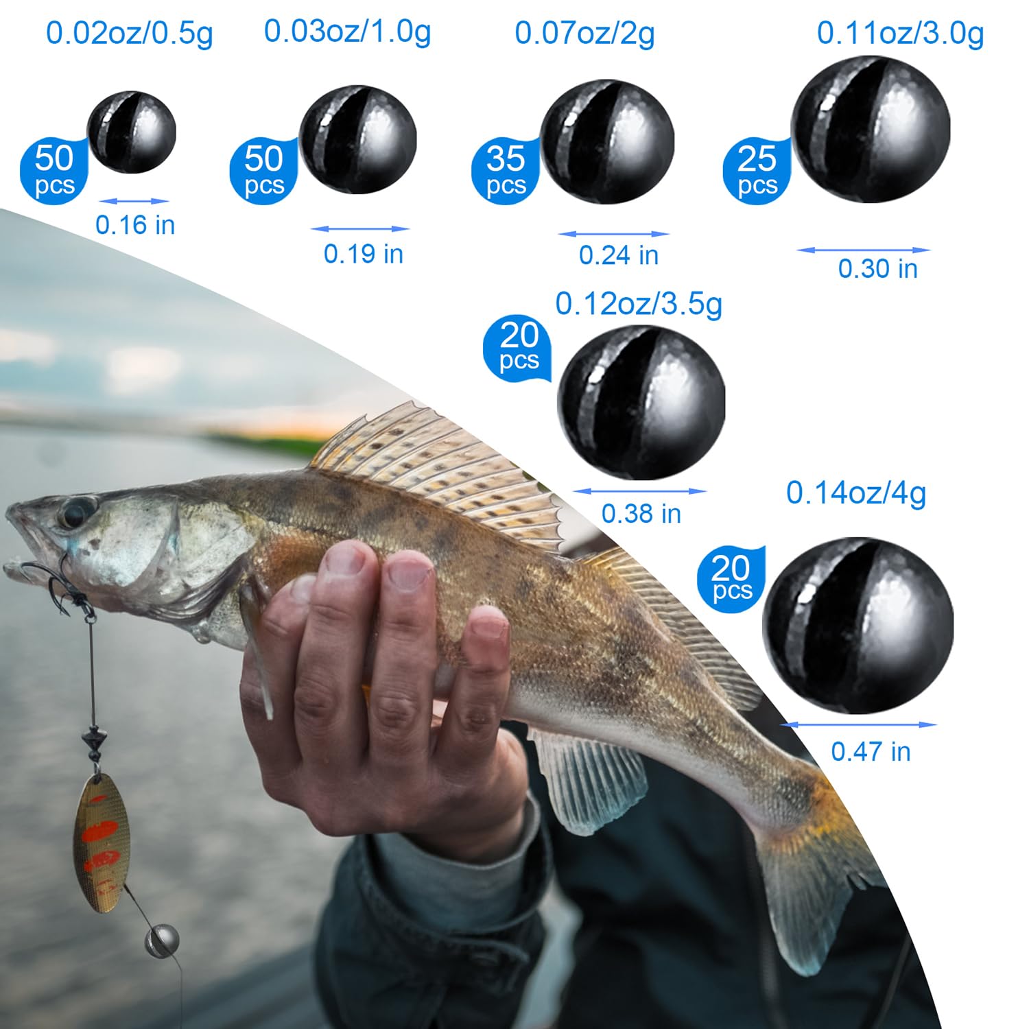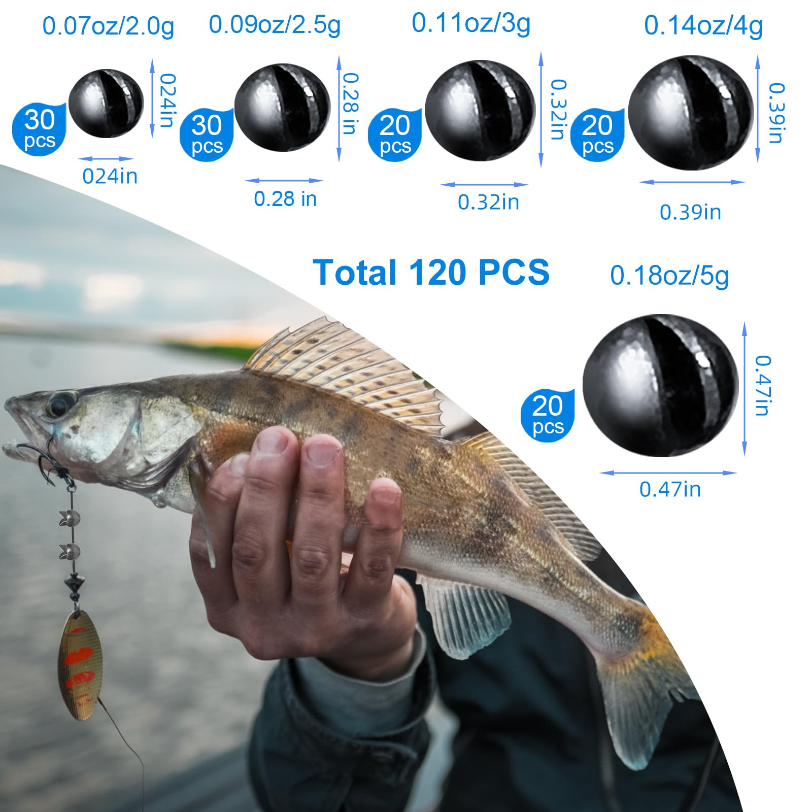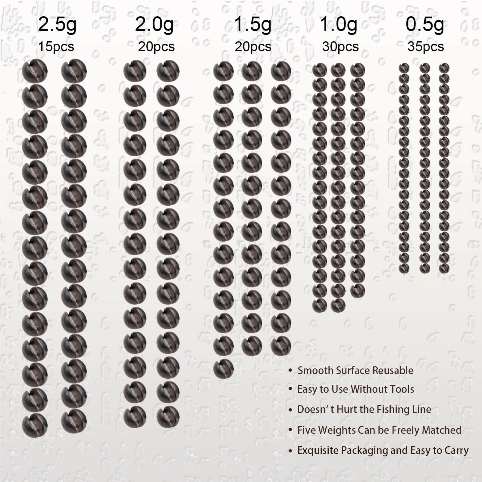 - Five Sizes: Our round sinkers can be used in different weight combinations for a wider range of applications. Includes 120 pcs of 5 different sizes of fishing weights, which are 0.09oz 15PCS, 0.07oz 20PCS, 0.06oz 20PCS, 0.04oz 30PCS, 0.02oz 35PCS.