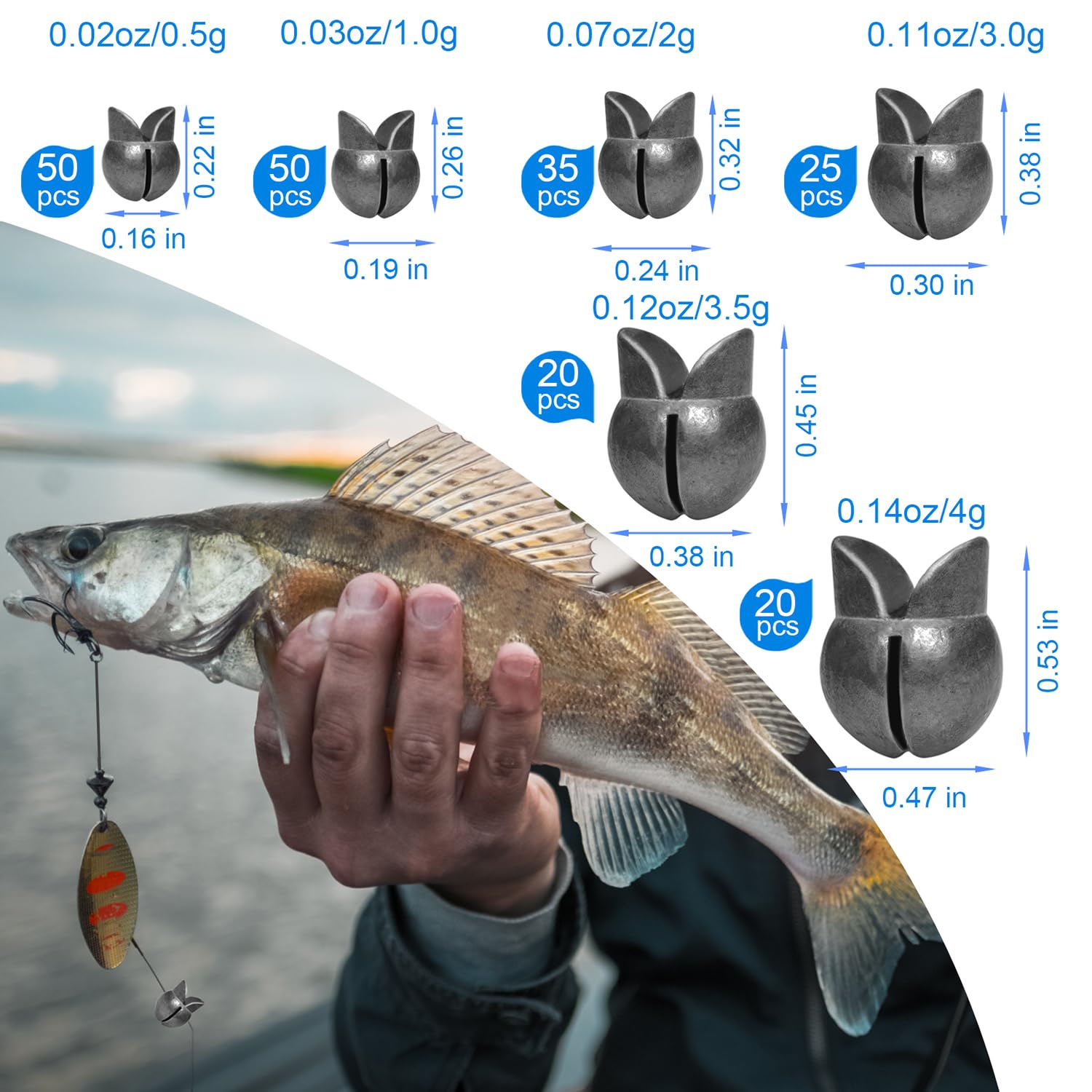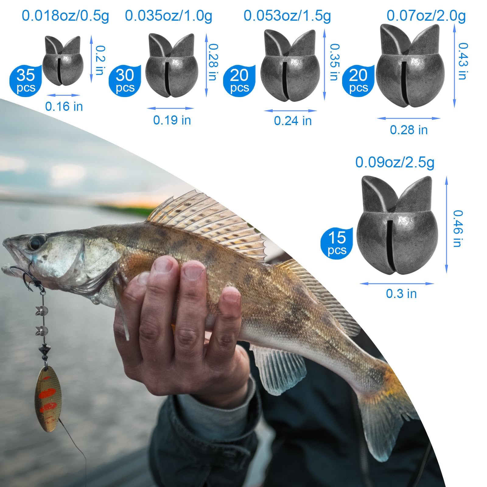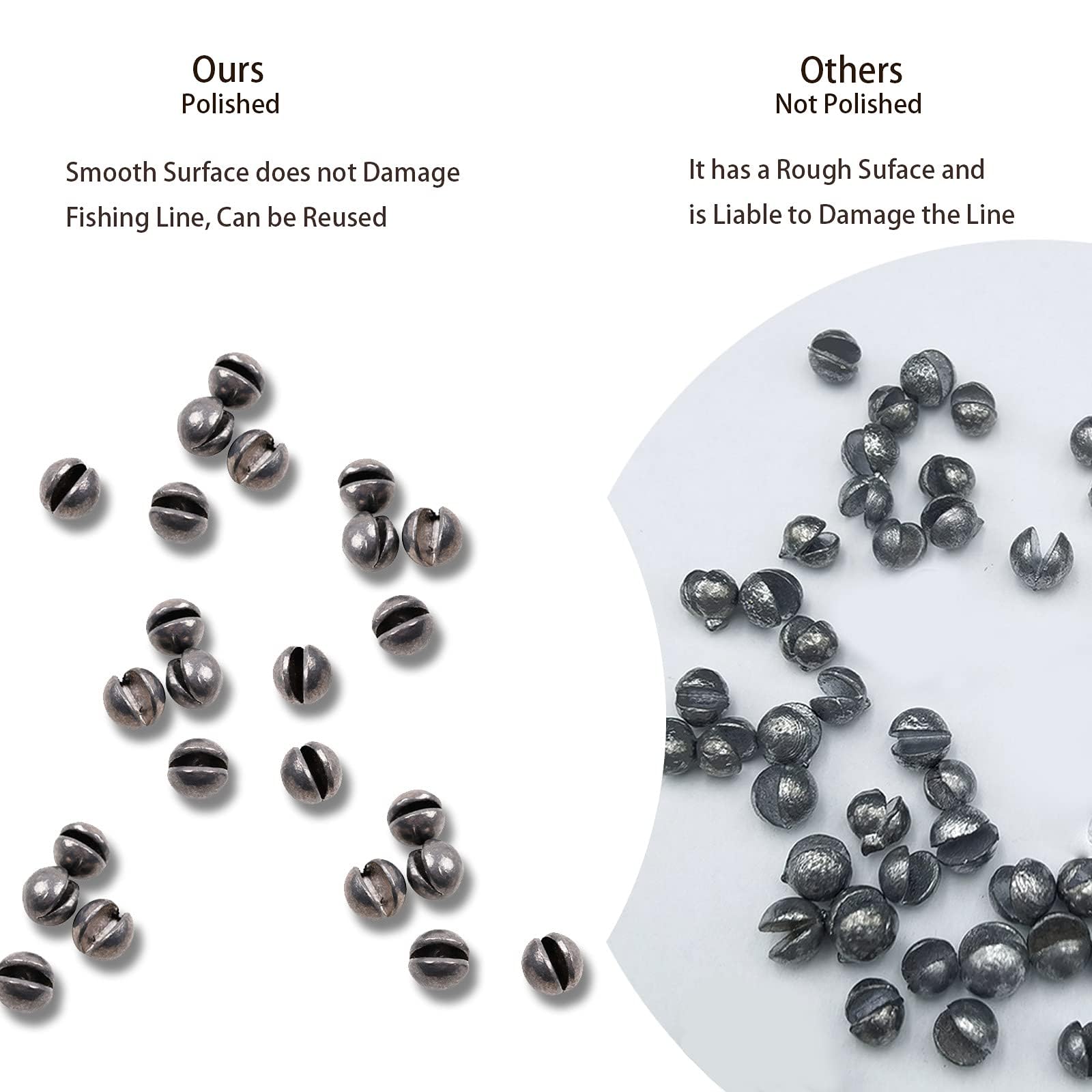 - Five Sizes: Our round sinkers can be used in different weight combinations for a wider range of applications. Includes 120 pcs of 5 different sizes of fishing weights, which are 0.09oz 15PCS, 0.07oz 20PCS, 0.06oz 20PCS, 0.04oz 30PCS, 0.02oz 35PCS.