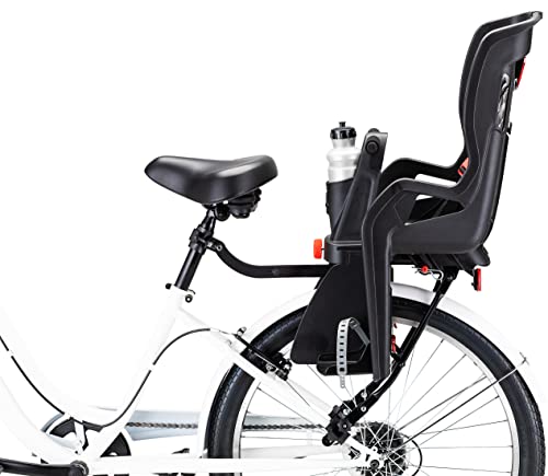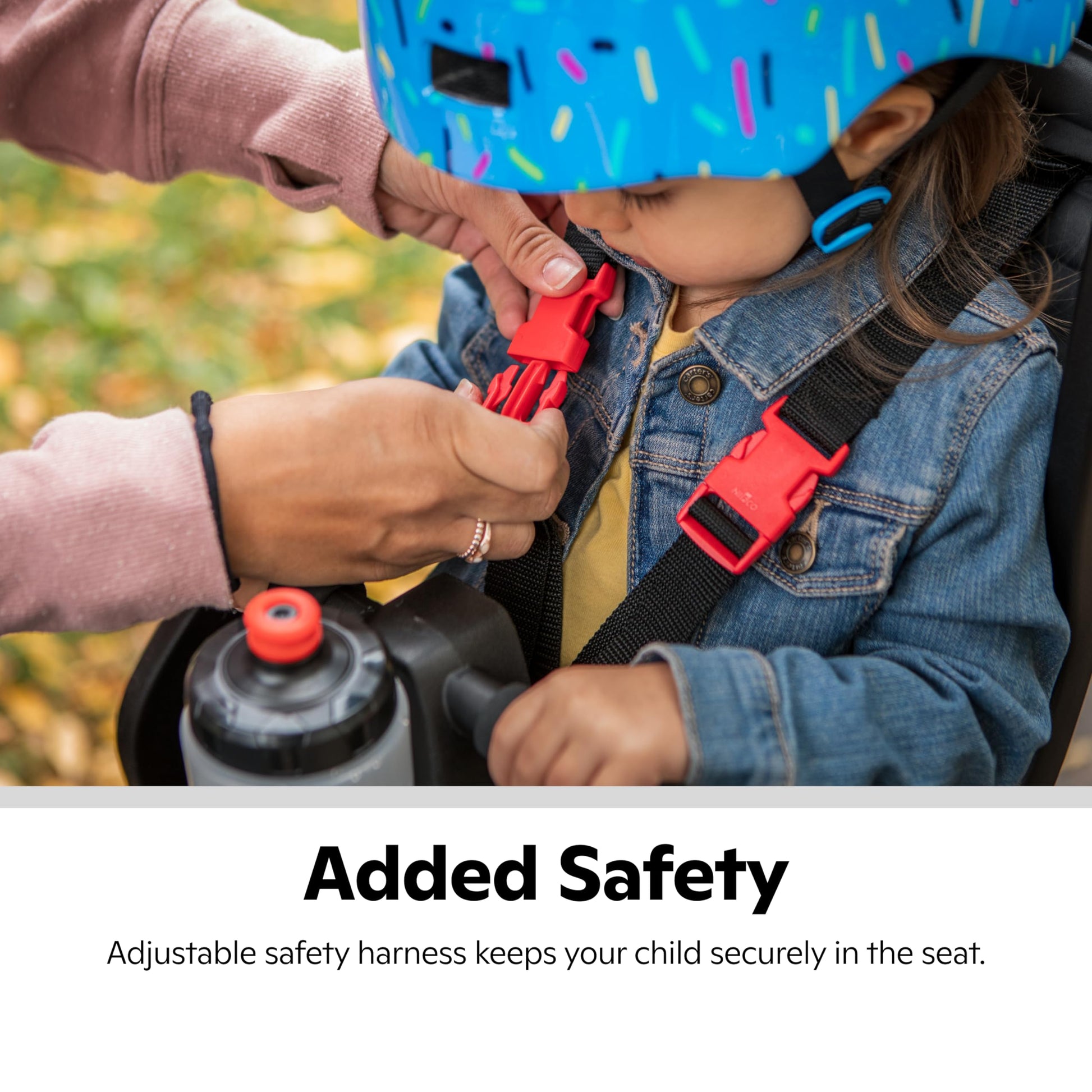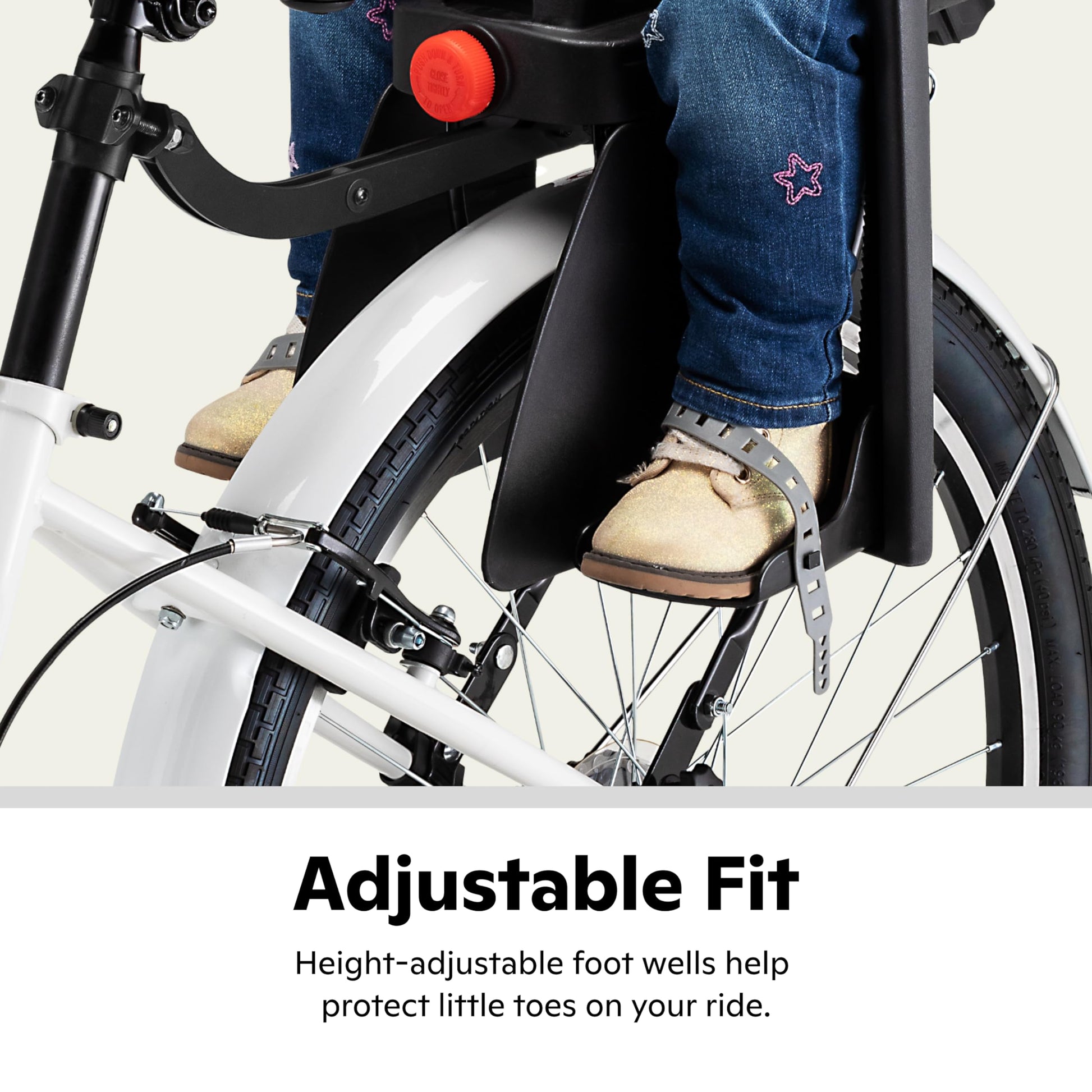 - SAFETY FIRST: Adjustable harness with side-clasp buckles and height-adjustable foot wells with safety straps keep your child securely fastened in the kid bike seat while riding.