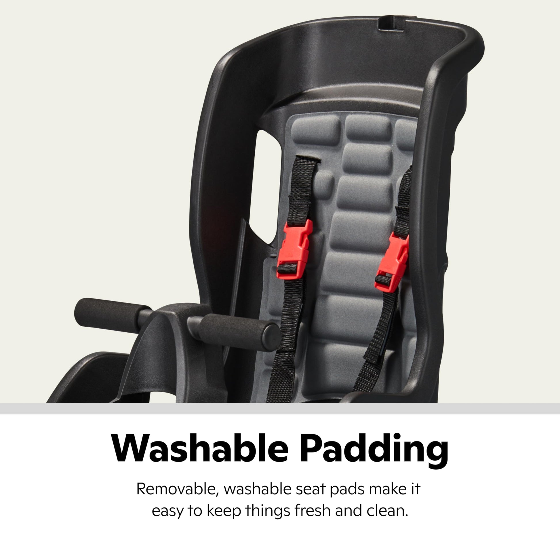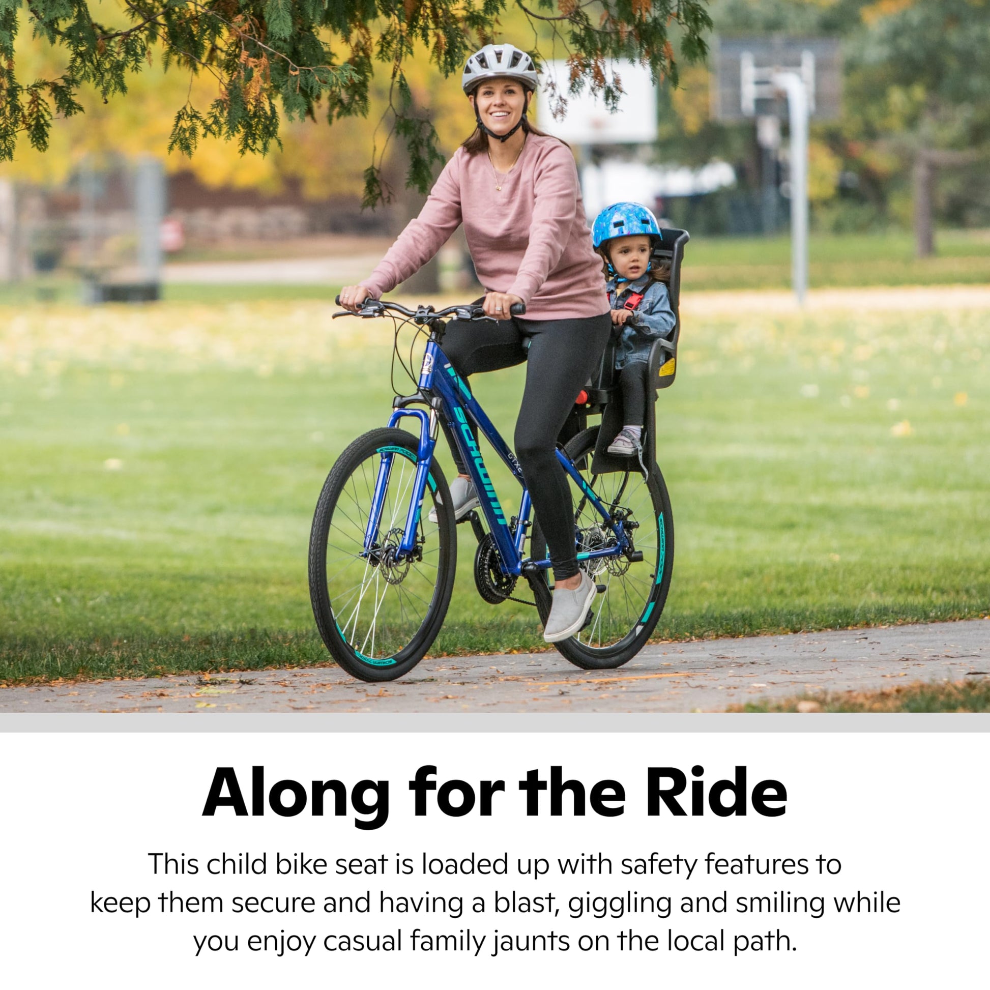 Details: Bring your little one along for the ride with the Schwinn Ovation Child Carrier. Designed for children ages 1 to 3 (up to 40 lb), this rear-mounted bike seat for kids securely attaches to most adult bicycles and features a quick-release design for hassle-free installation and removal. Your child stays safe and snug thanks to the adjustable harness with side-clasp buckles and height-adjustable foot wells with secure retention straps. The padded seat and backrest are removable and washable for easy maintenance, while the padded T-handle provides both comfort and convenience, complete with an integrated bottle holder. Whether you're cruising through the neighborhood or heading to the park, the Schwinn Ovation Child Carrier ensures you can enjoy the freedom of riding – together.