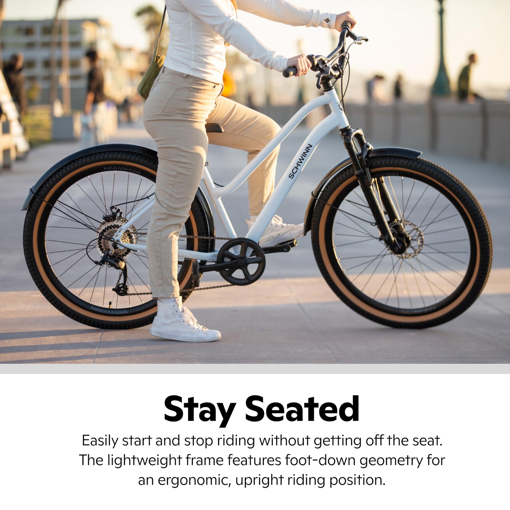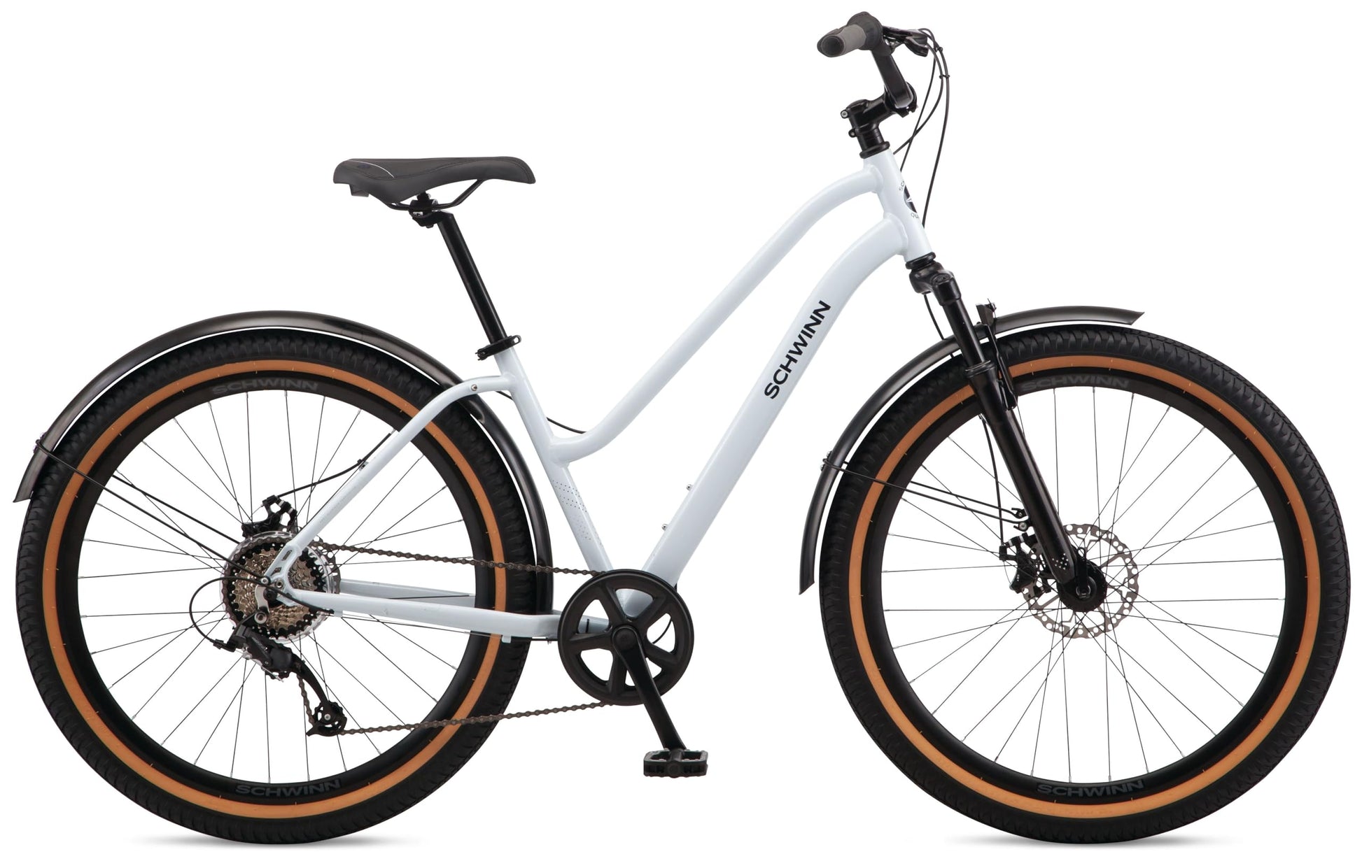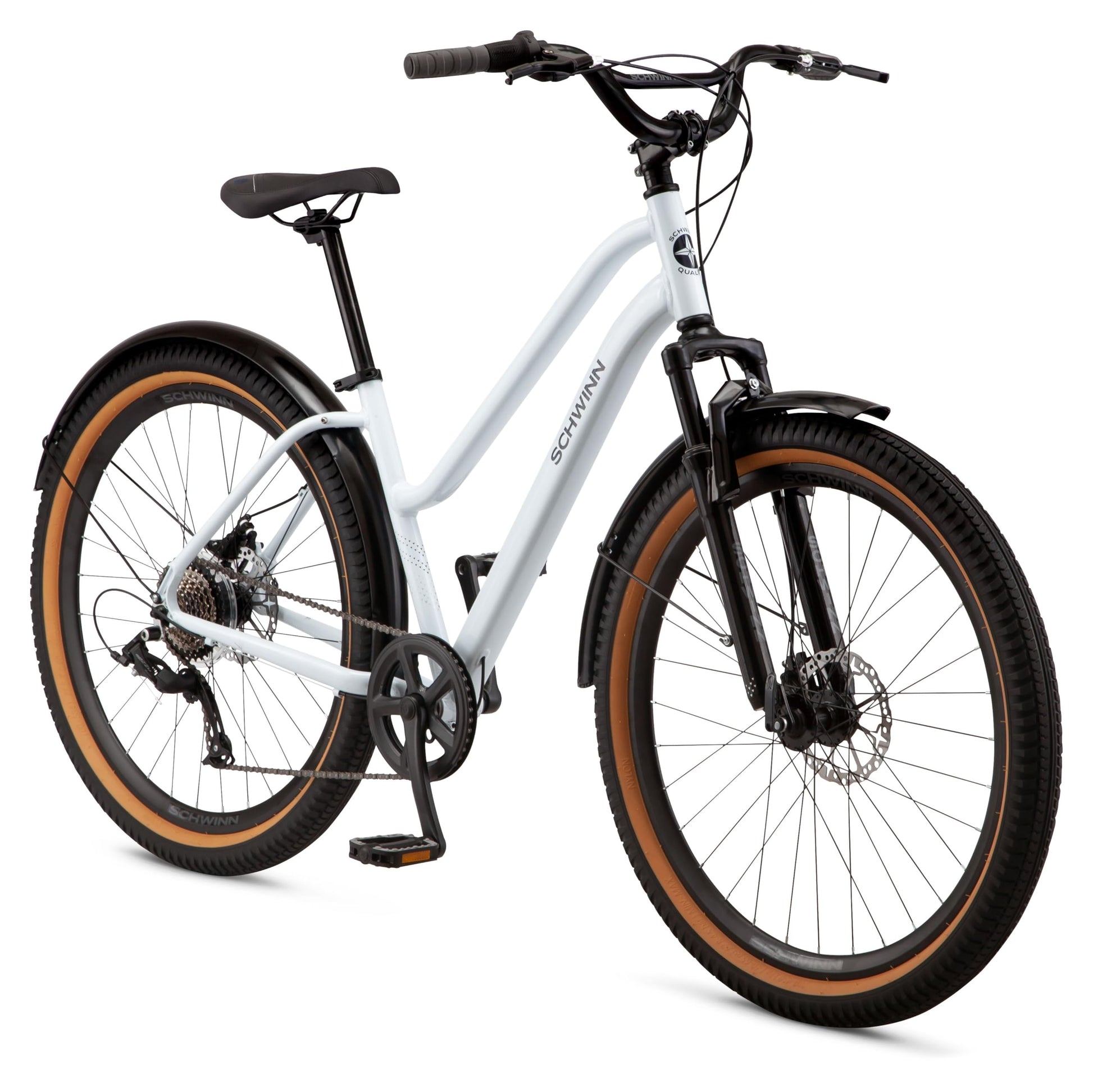 Details: Enjoy the ride with the Schwinn Vega CE Hybrid Comfort Bike, a smooth-riding bike that blends retro style with modern practicality. Designed for easy rides, this women's and men's hybrid bike for adults looks as good as it feels. Retro fenders protect from splashes, while 2.4-inch-wide tires provide stability and a gentle ride. The 8-speed twist shifter and mechanical disc brakes ensure easy handling in varied conditions, and the suspension fork delivers a comfortable ride. The lightweight frame’s foot-down geometry ensures an ergonomic, upright riding position. With 27.5-inch wheels and a medium frame size, this hybrid bicycle fits riders 5'5" - 5'9" and is perfect for zipping around the neighborhood or down bike paths. Assembly is easy with a few common household tools and the included instruction guide. Comes with a limited lifetime warranty for as long as you own the bike. At Schwinn, we're empowering millions to enjoy the joy and freedom of riding.