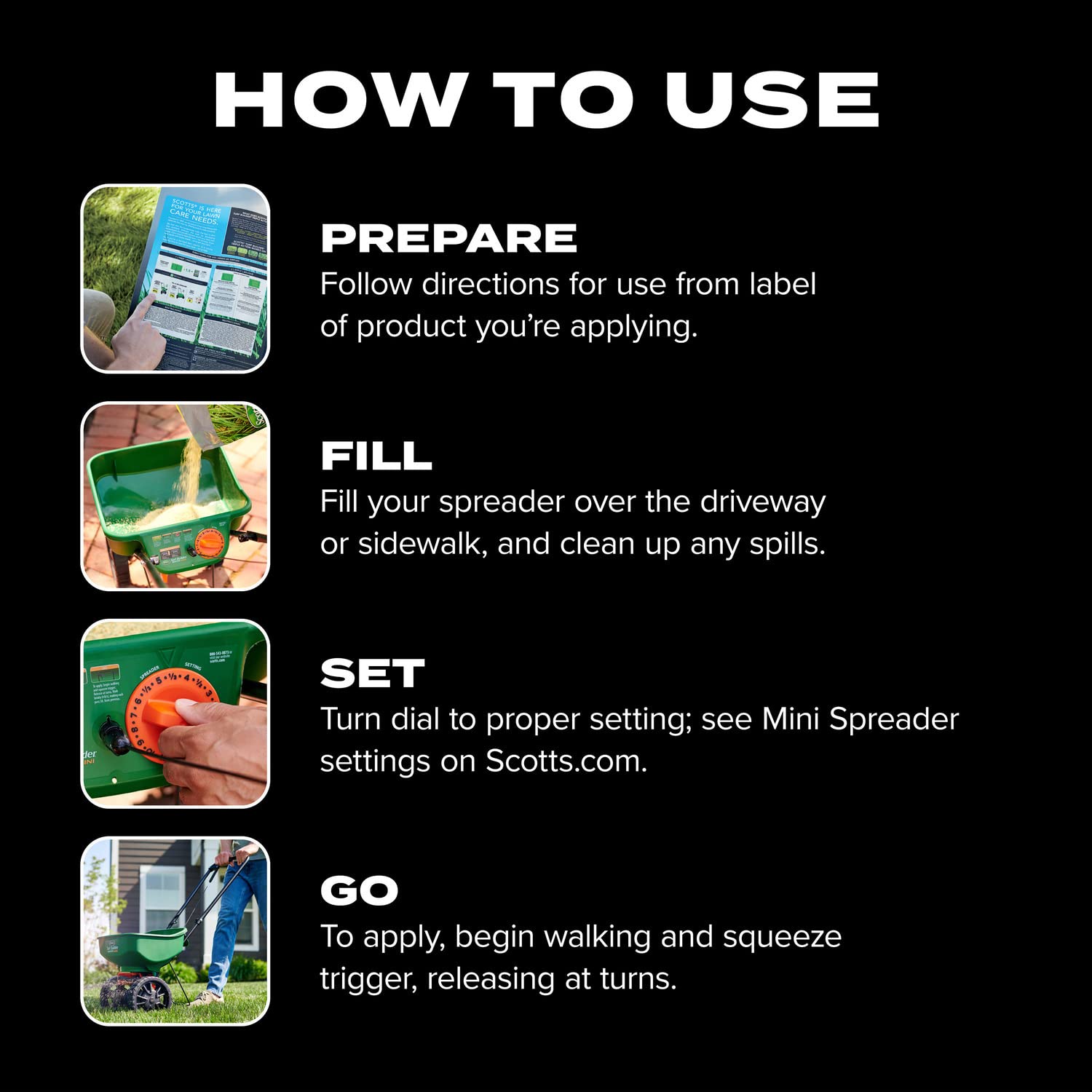 Details: Use the Scotts® Turf Builder® EdgeGuard® Mini Broadcast Spreader to apply fertilizer, grass seed, salt and ice melt. This lawn spreader comes pre-calibrated and ready-to-use, and holds up to 5,000 sq. ft. of Scotts® product. When EdgeGuard™ is engaged, it will block off the right-side of the spreader pattern to prevent product from spreading onto non-lawn areas. Using the Scotts® Turf Builder® EdgeGuard® Mini Broadcast Spreader is simple. To begin, turn rate control dial to the correct setting listed on the back of each Scotts® product, pour the product in the hopper, then start spreading. The lawn spreader's design enhancements feature a curved hopper and dual-bladed agitator for smooth product funneling and consistent coverage. Not to mention, it is compact and features a fold-down handle for easy storage. Spreaders provide uniform coverage of granular products; without one, you may end up with uneven coverage of fertilizer or control products that can result in uneven feeding, weed, disease, or insect control. Scotts® spreaders can also be used to distribute salt on walkways and driveways.