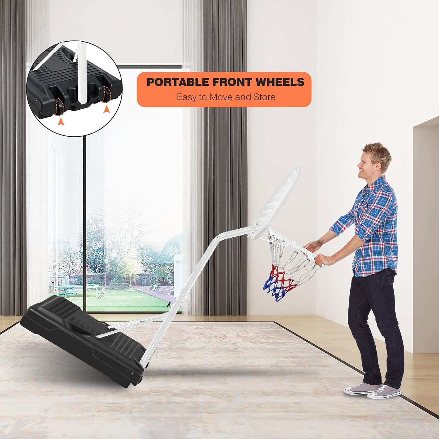 - 【Portable Design】Portable basketball goal is designed with two built-in front porting wheels, making the basketball hoop easy to move to anywhere, no matter indoor or outdoor. It can be used at the poolside, beach, backyard, garden, playground, court and indoors.