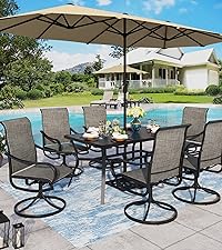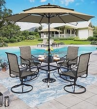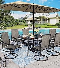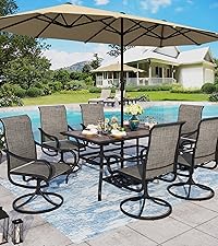 - E-coating Technology: Our furniture is coated with advanced E-coating technology, ensuring superior weather resistance and a longer lifespan. The set includes a 6-person dining table paired with swivel chairs, making it perfect for a family of four. Enjoy the outdoors with this durable and stylish set that's designed to last