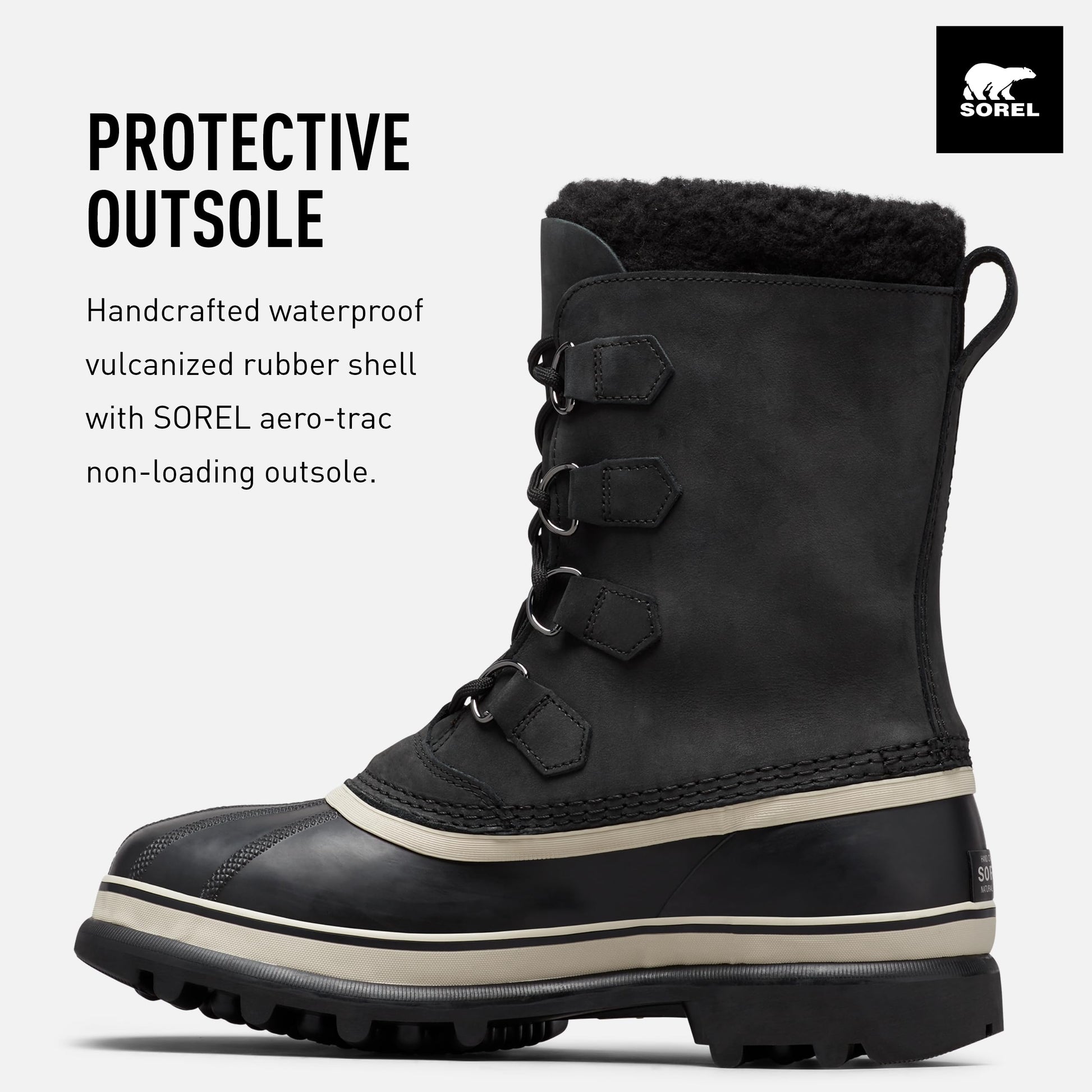 - Caribou Snow Boots: This winter boot for men with laces allows you to adjust the tightness for a secure feel; the waterproof boot features a handcrafted, waterproof, and vulcanized rubber shell with a SOREL aero-trac non-loading outsole