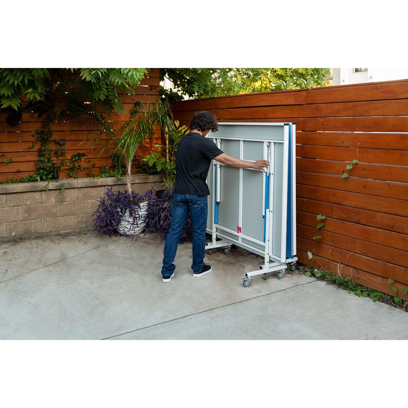 Details: Skip the stress of rearranging furniture to fit a table tennis table inside your home and enjoy table tennis outdoors. The STIGA XTR Outdoor table is designed and manufactured with durable, all-weather materials such as aluminum, exterior grade powder coating, and galvanized steel for a table that is waterproof, rust-free, and resistant to sun damage, making it perfect for year round outdoor storage in any climate. This table comes 95% preassembled with only one simple step to complete so you can begin playing in less than 10 minutes. The 6mm aluminum/composite top is supported by a stout 1.5" tubular steel apron to deliver lively and even bounce across the entire surface and resists warping under any condition. The table includes a 72" exterior grade net and post set with string tension adjustment for excellent playability. Below the table, sturdy 1.25" welded steel legs include a self-opening feature so they automatically deploy when opening or folding the table halves for added convenience and safety. The legs also include adjustable height leg levelers to ensure your table has a solid, level playing surface on any terrain. For added flexibility and mobility, the table features 3" ball-bearing wheels that smoothly roll and lock into place for safety. This table includes playback mode for individual practice and each table half can be separated and used as a free-standing multi-purpose table for dining, playing cards, and more. After playing, conveniently fold each table half into the upright position, lock into place with the red safety latch, and roll to the desired location for convenient storage. The separate table halves of the XTR nest together for an ultra-compact folded profile so it can fit into any space.