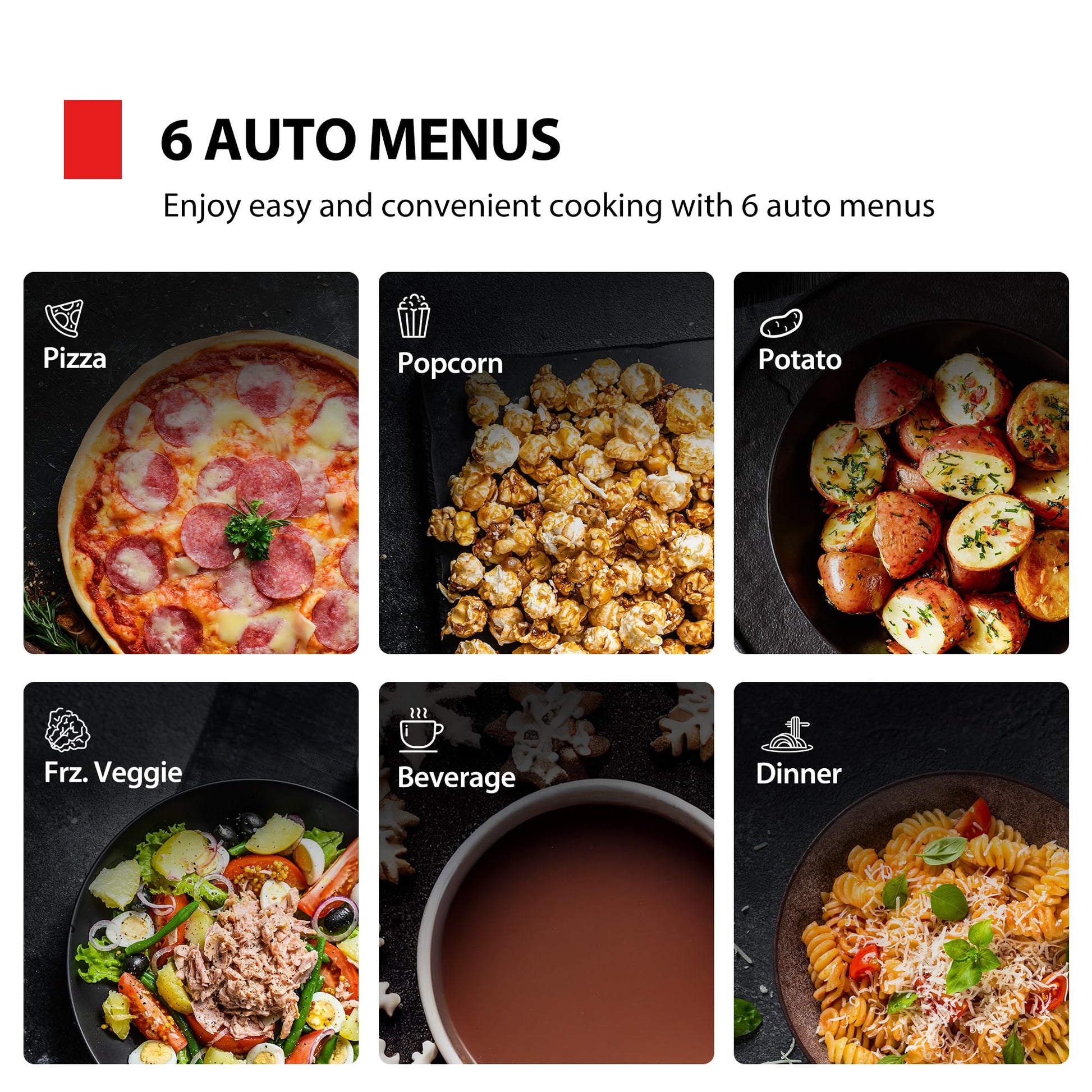 - 6 Auto Menus: Countertop microwave oven featuring 6 auto menu options for popular foods like popcorn, pizza, potato and more.
