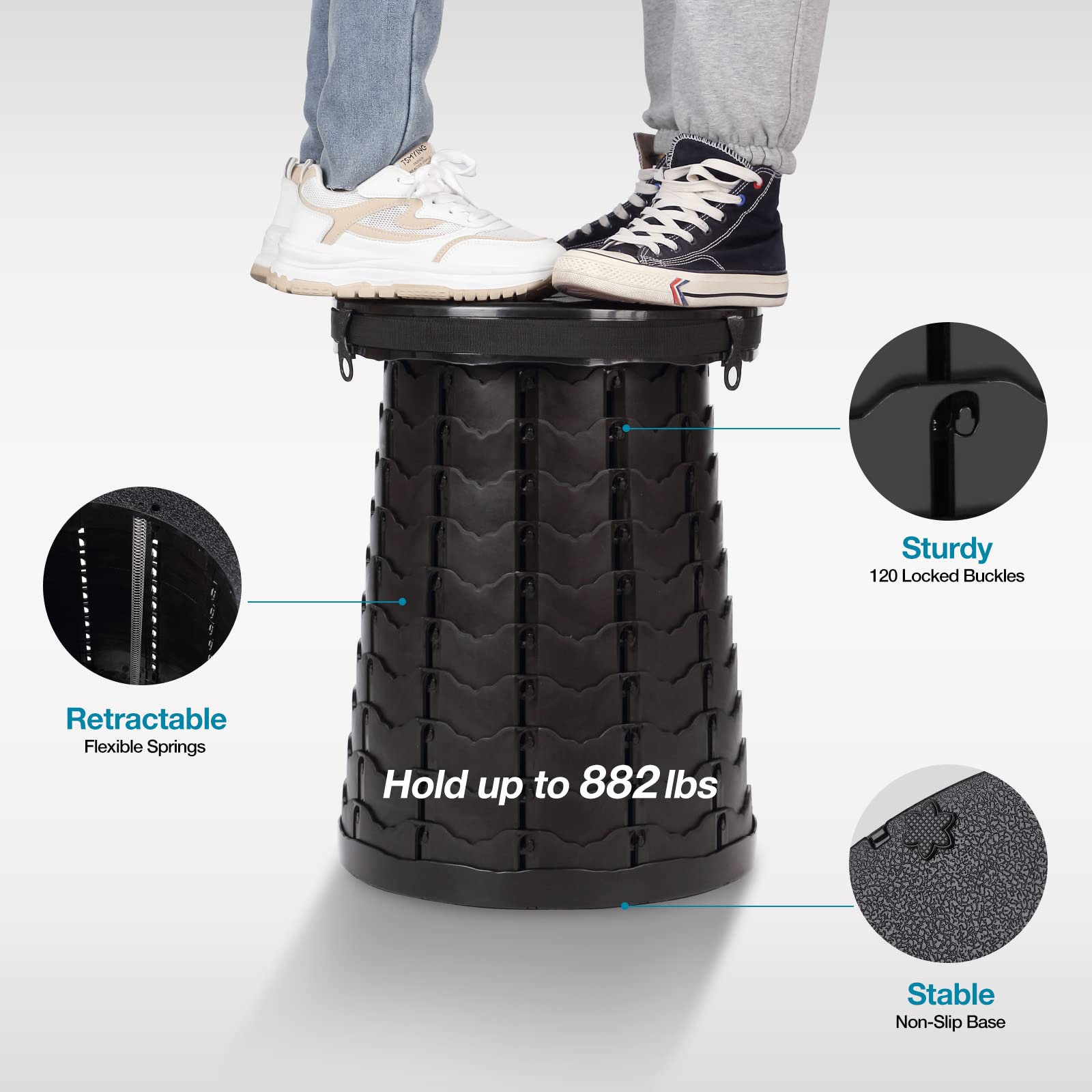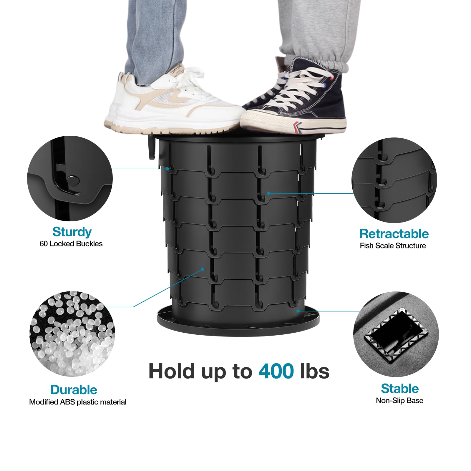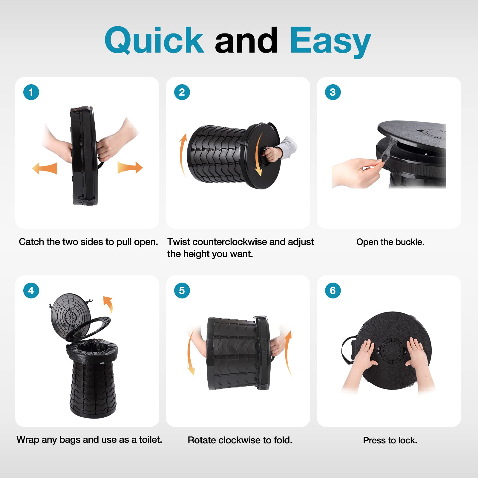 - 【STURDY & DURABLE】 Modified ABS plastic material, 70 locked buckles and non-slip bases make the toilet remarkable stability and durability. Load capacity reaches 380 lbs far more than others. Providing a safe, compact and comfortable travel toilet is always what we want to do for our customers around the world.