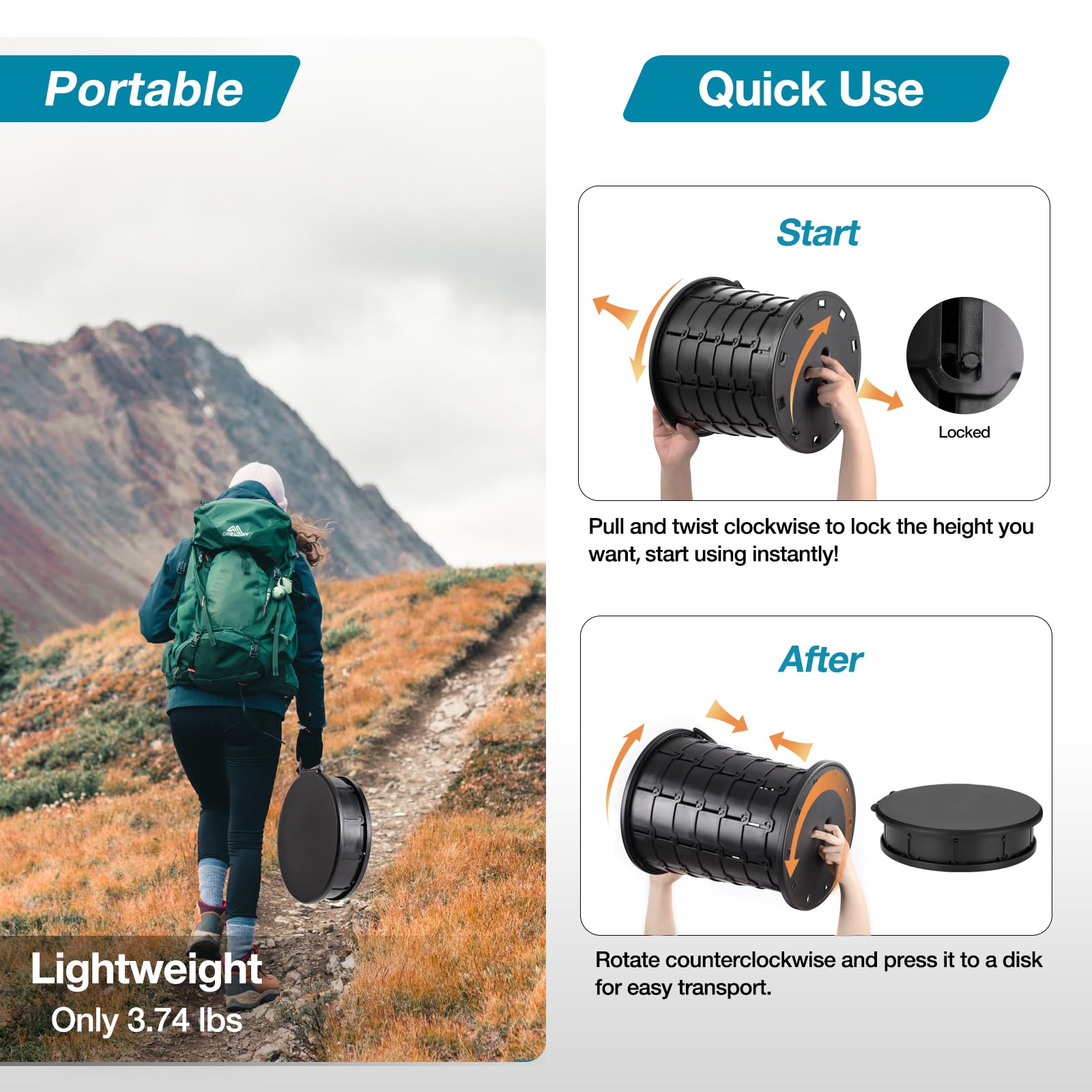 - 【QUICK& EASY】 One pull and twist clockwise to start using instantly! Make sure all buckles are locked firmly before sitting. After use, just rotate counterclockwise and press it to a disk for easy transport. This folding toilet is small and lightweight, only 2.75lbs. Easy to carry with our waterproof handy bag. You can easily place it in your backpack, luggage or cars.