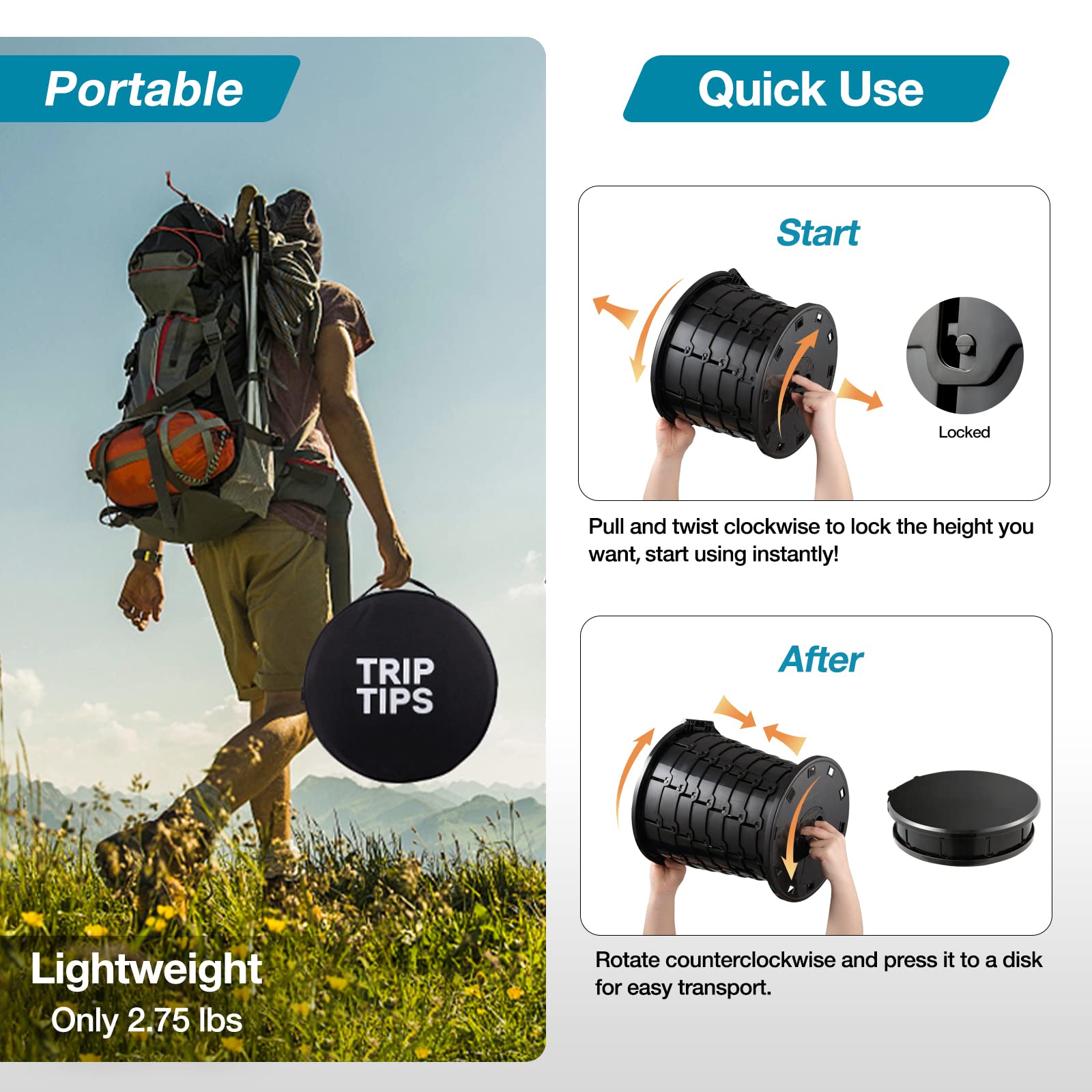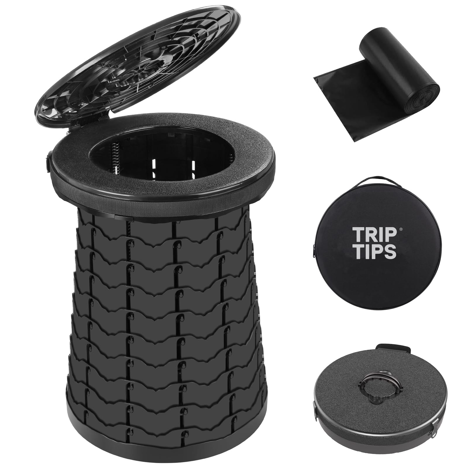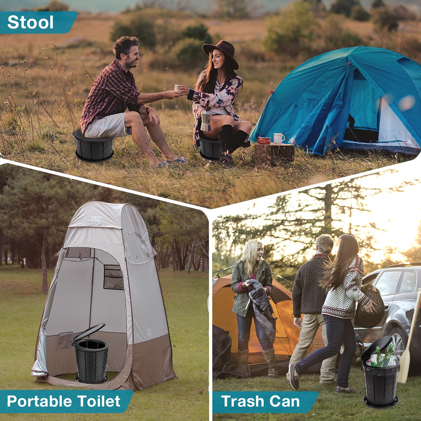 MULTI-FUNCTIONAL: TRIPTIPS folding portable toilet can be used not only as a camping toilet for outdoors, but also a trash can, collapsible stool, storage box, indoor toilet for the elderly, vomiting bucket for pregnant women, etc.