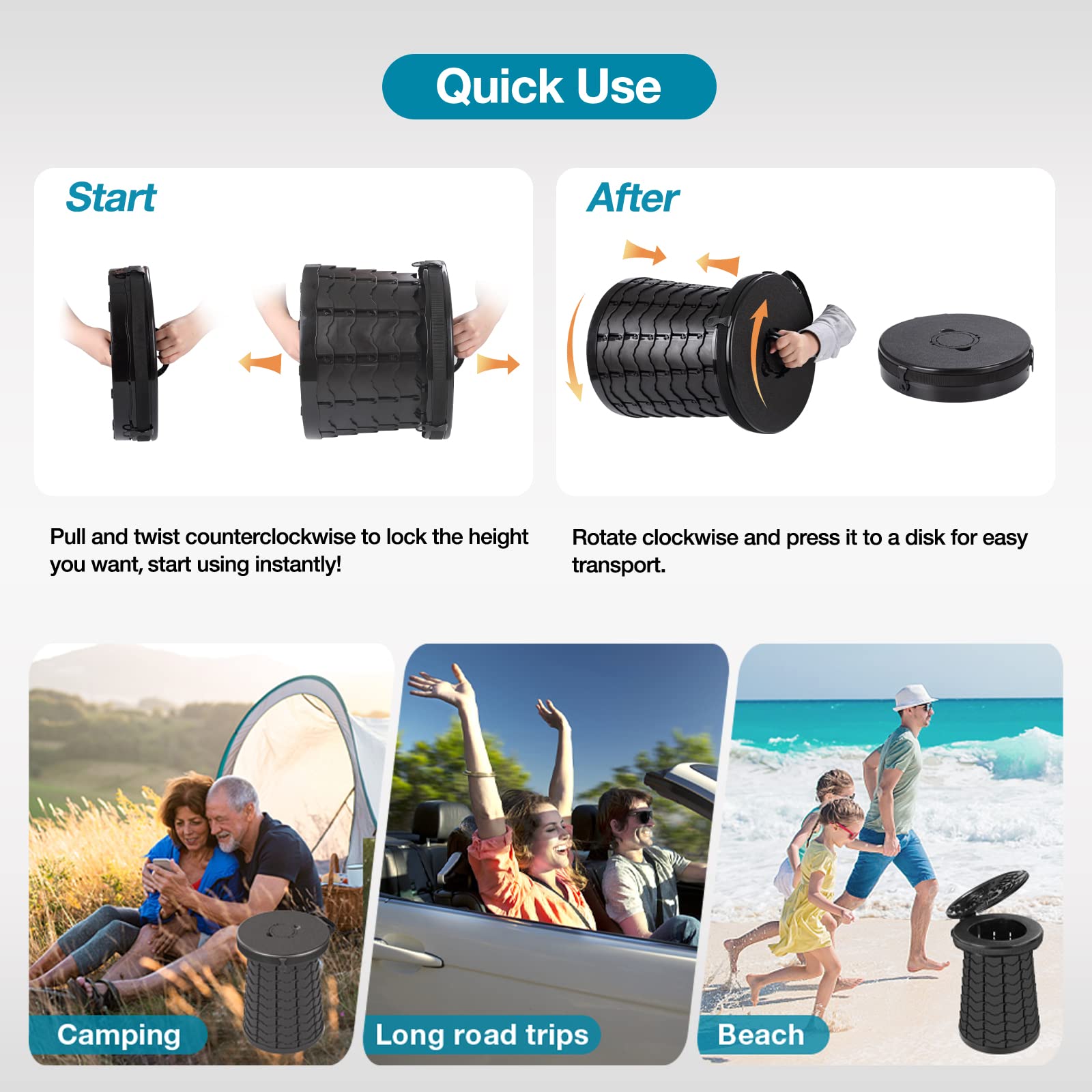 - 【MULTI-FUNCTIONAL】 Functional cover design, makes you free to switch various modes of use, as a camping toilet, a collapsible stool, a storage box,a side table or a trash can. It is not only a perfect portable toilet for camping, hiking, long trips, fishing, boating, traffic jam etc. But also a good portable potty for adults and kids indoor.