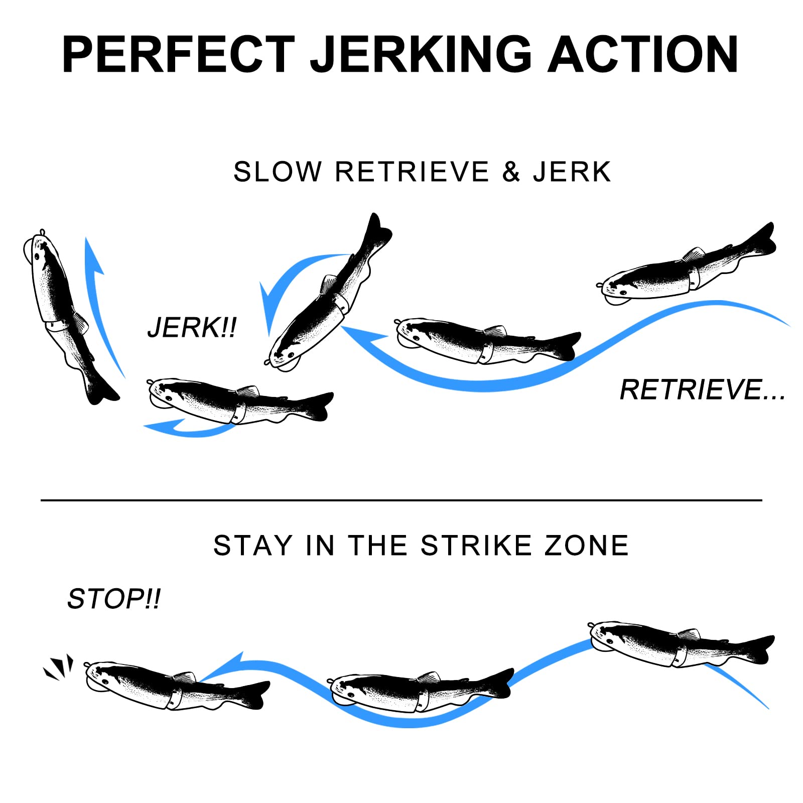 Stop the bass lure for a few seconds in a random way, this will create an irresistible "slow floating" action at the strike zone. Its jointed tail section creates a slightly exaggerated action which helps to trigger otherwise disinterested or tentative fish.