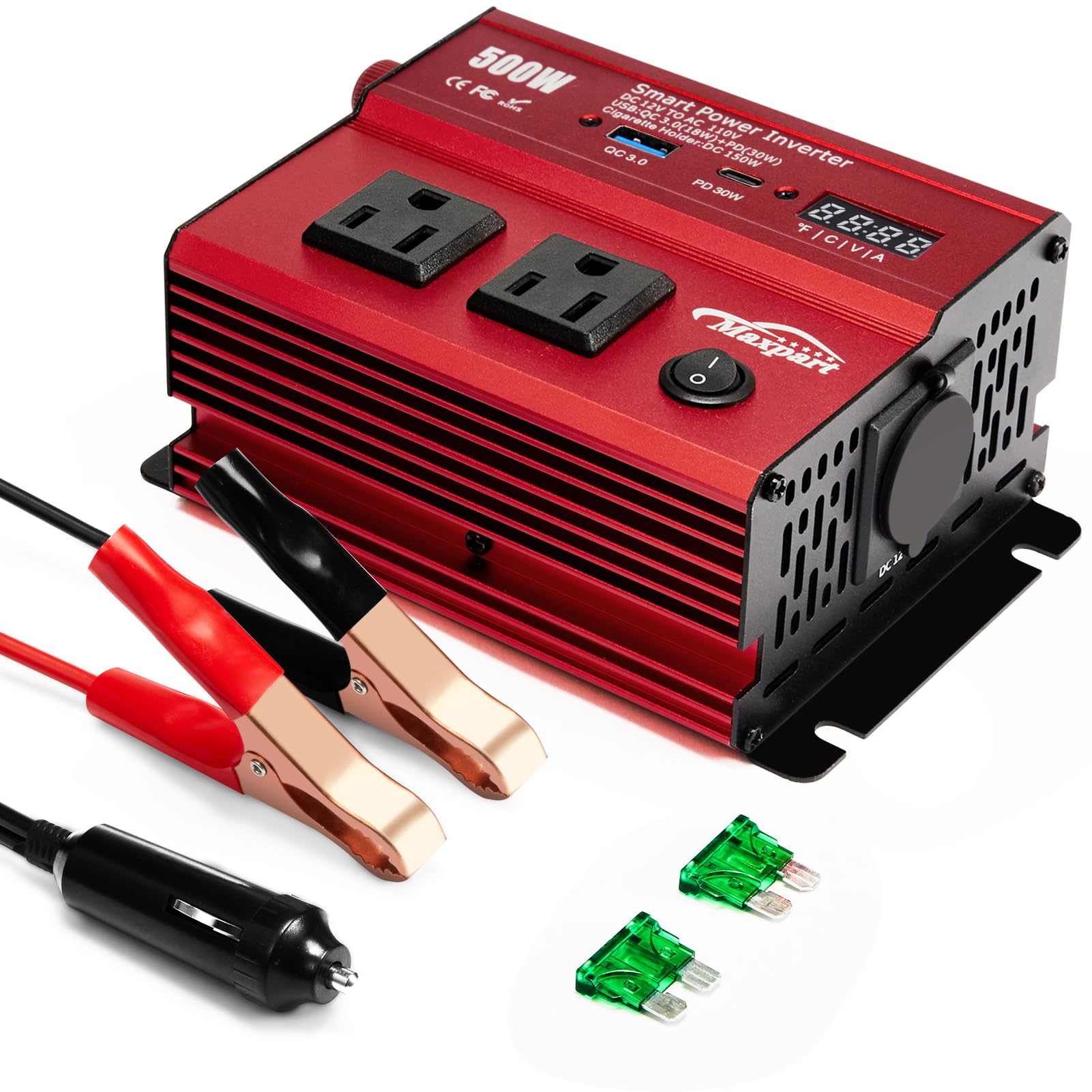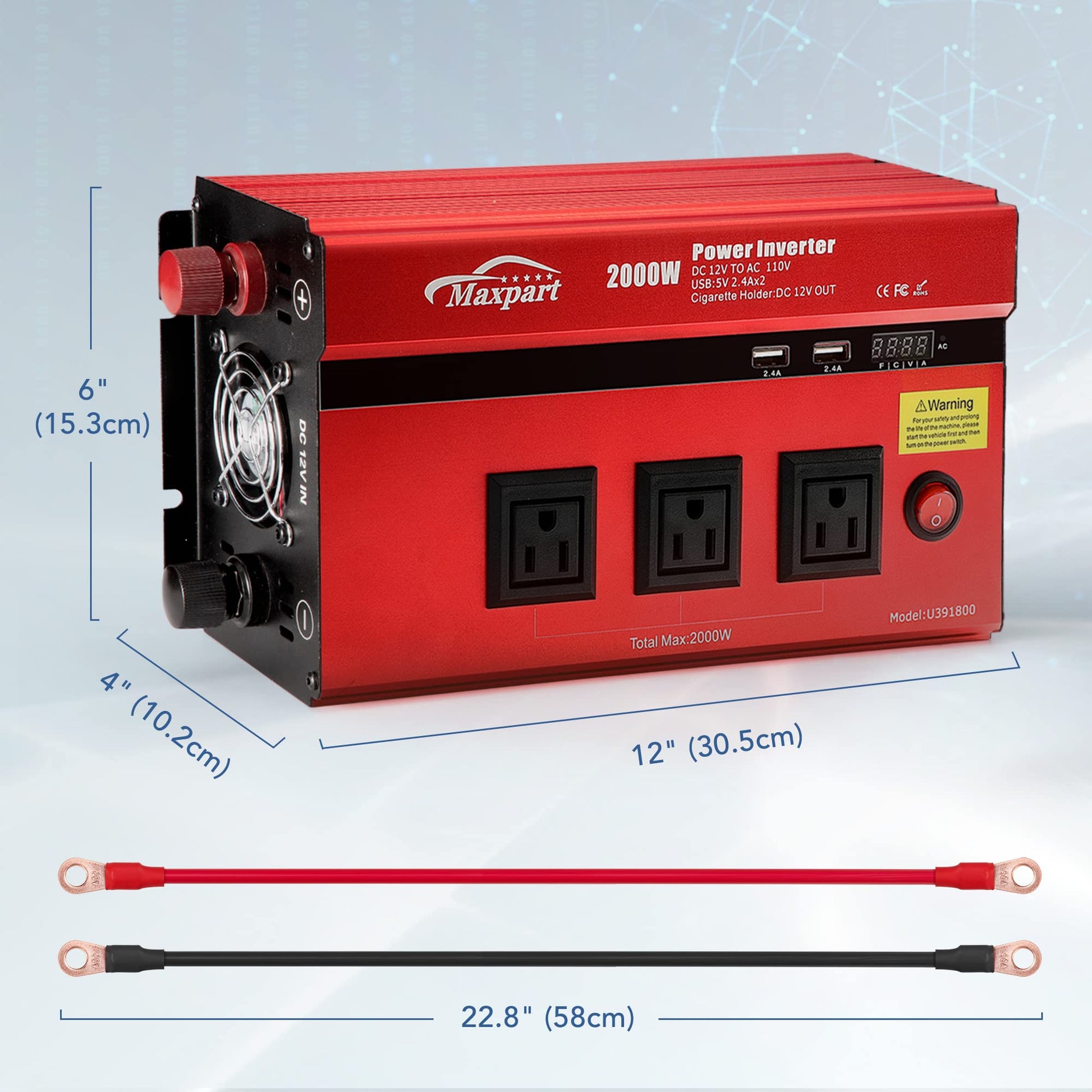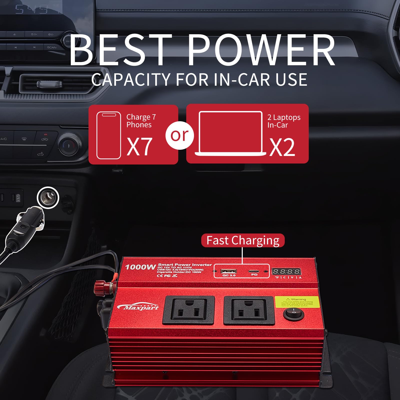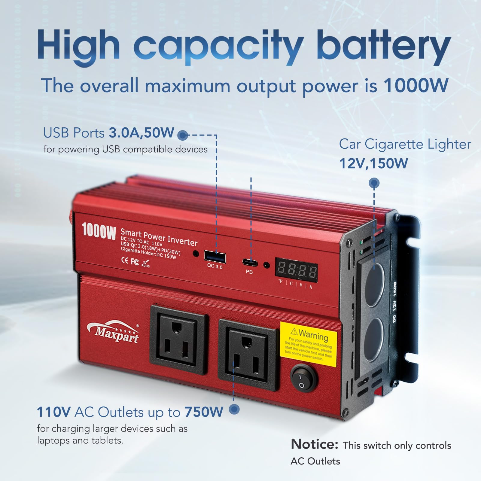 - Power Inverter 1000 Watt :The Home and outdoor Maxpart manufacturer Pro inverter provides dual 110V AC outlets with continuous DC to AC power output, converts 12V DC battery power to standard 110V AC, featuring 2 AC outlets and 2 USB ports( QC 3.0 and 30W PD3.0)