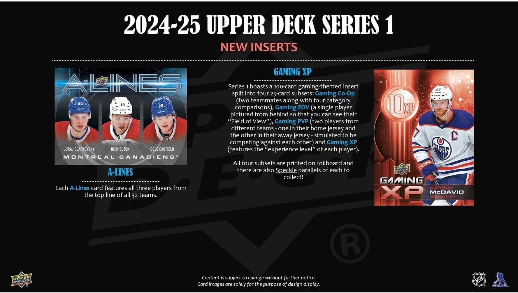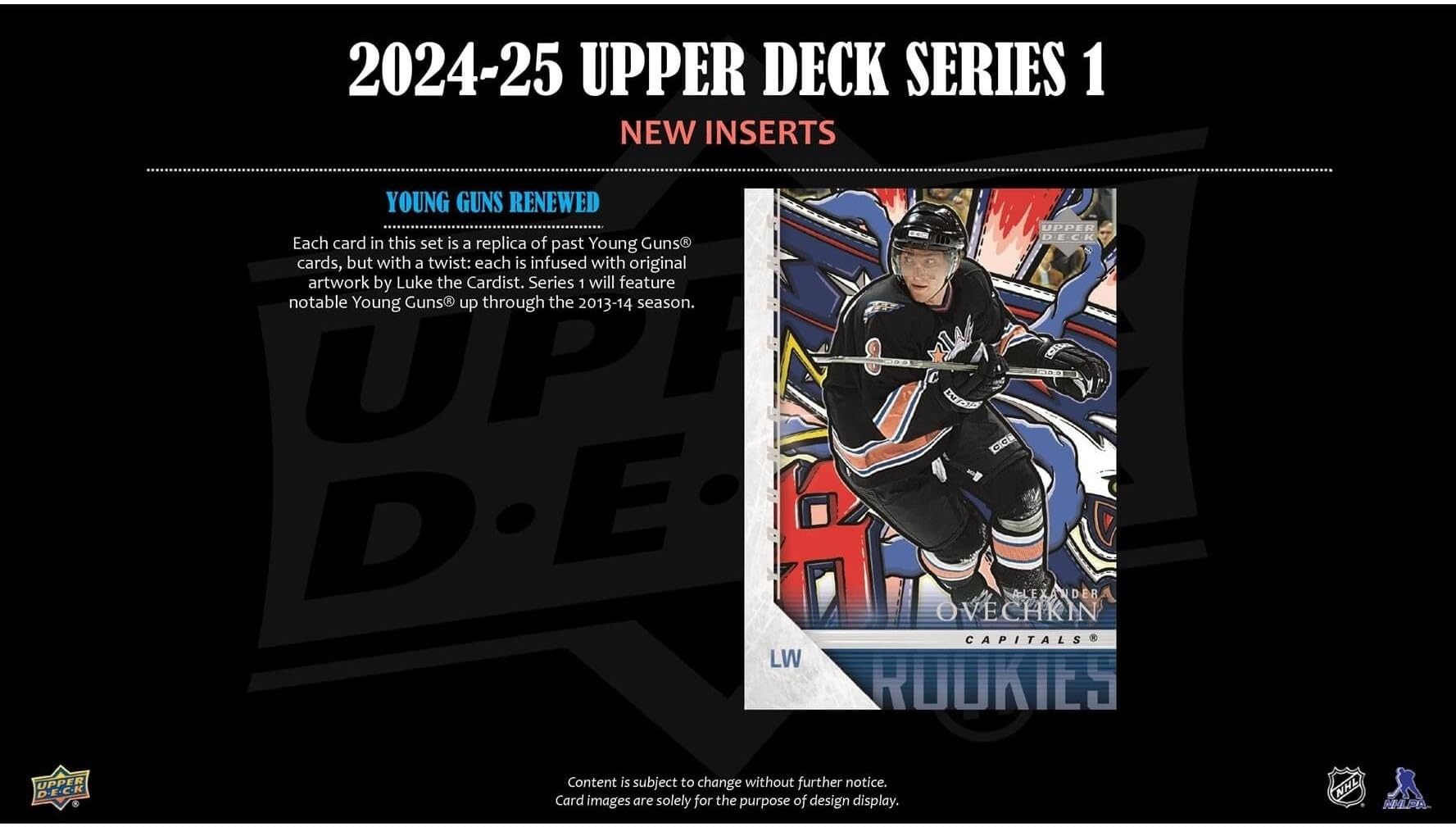 Details: Series 1 sports the first 250 cards of the 2024-25 Upper Deck Base Set. Annually, the Upper Deck Base Set is the most widely-collected Base Set in hockey. It includes 198 veteran cards, 49 Young Guns rookie cards and three checklist cards. The iconic Young Guns are the most anticipated rookie cards of the season.