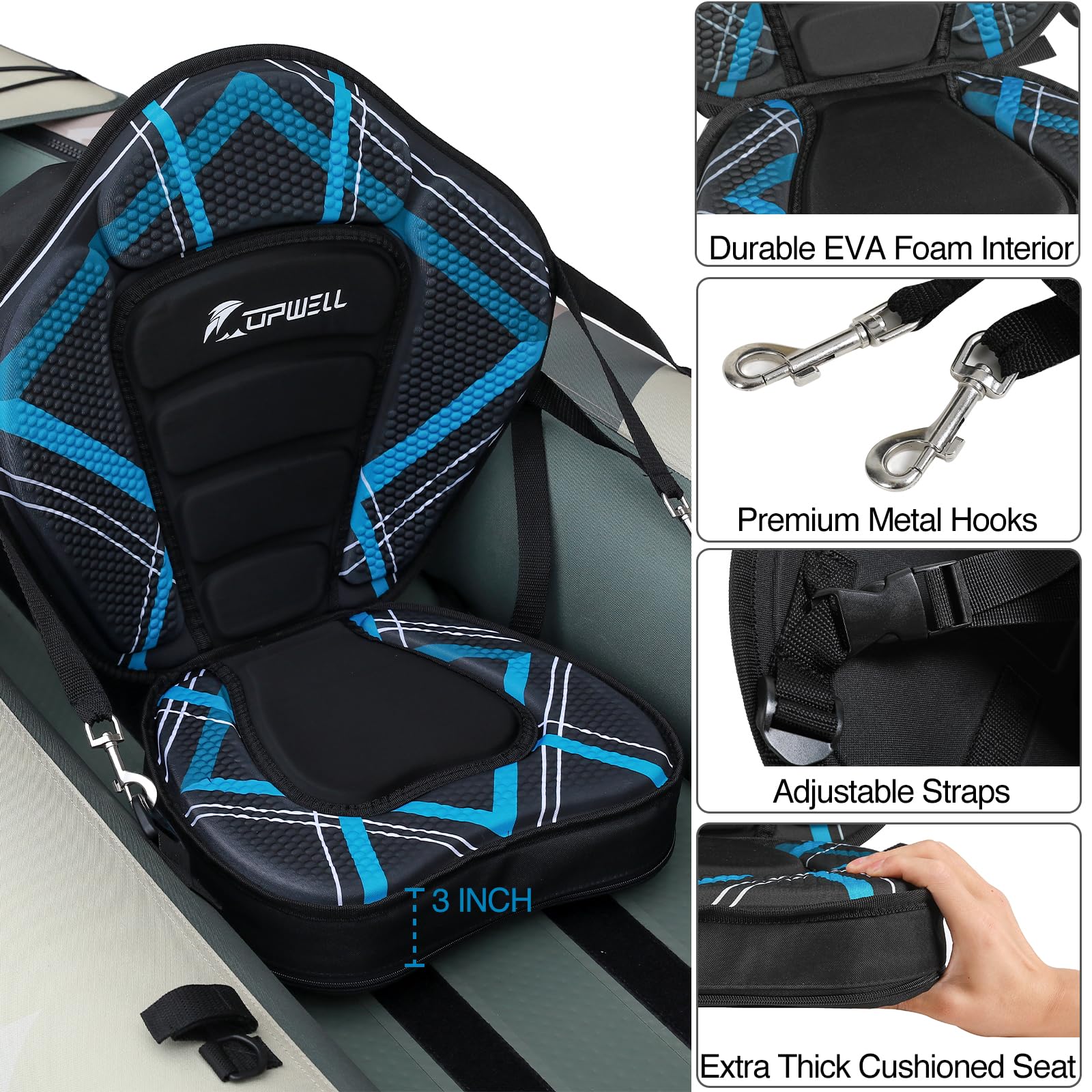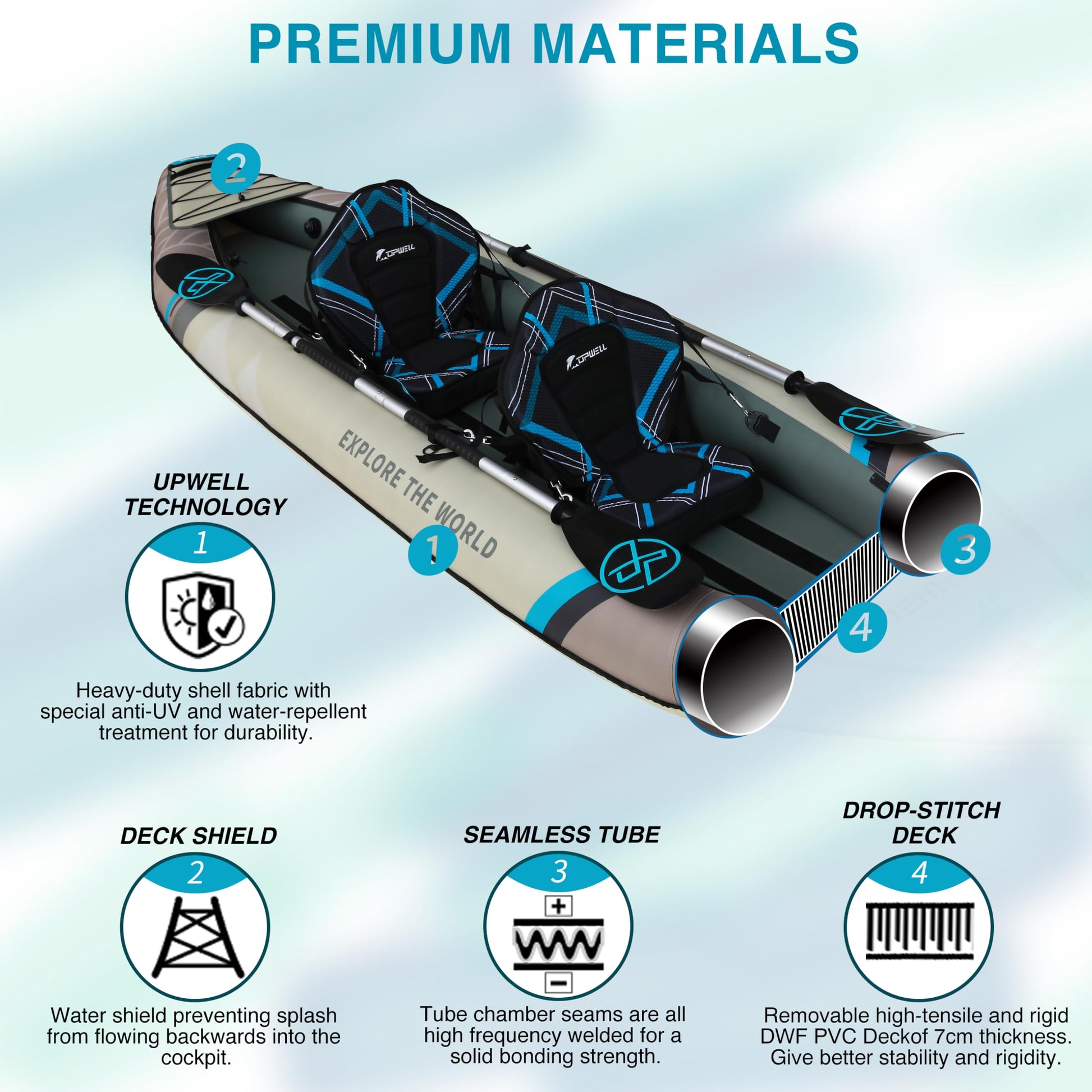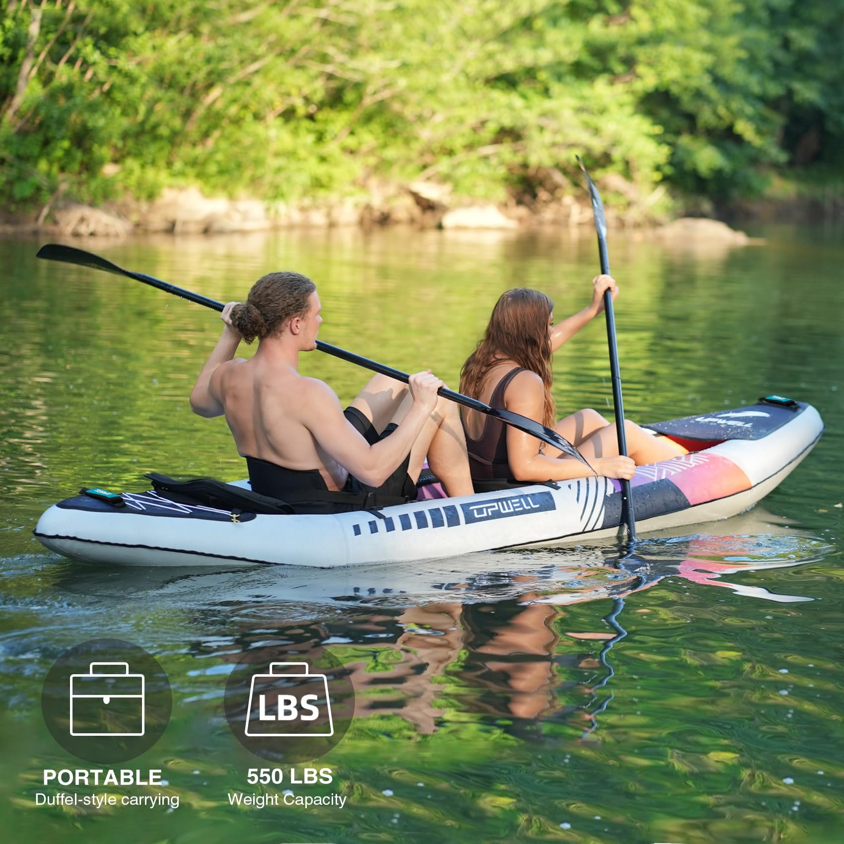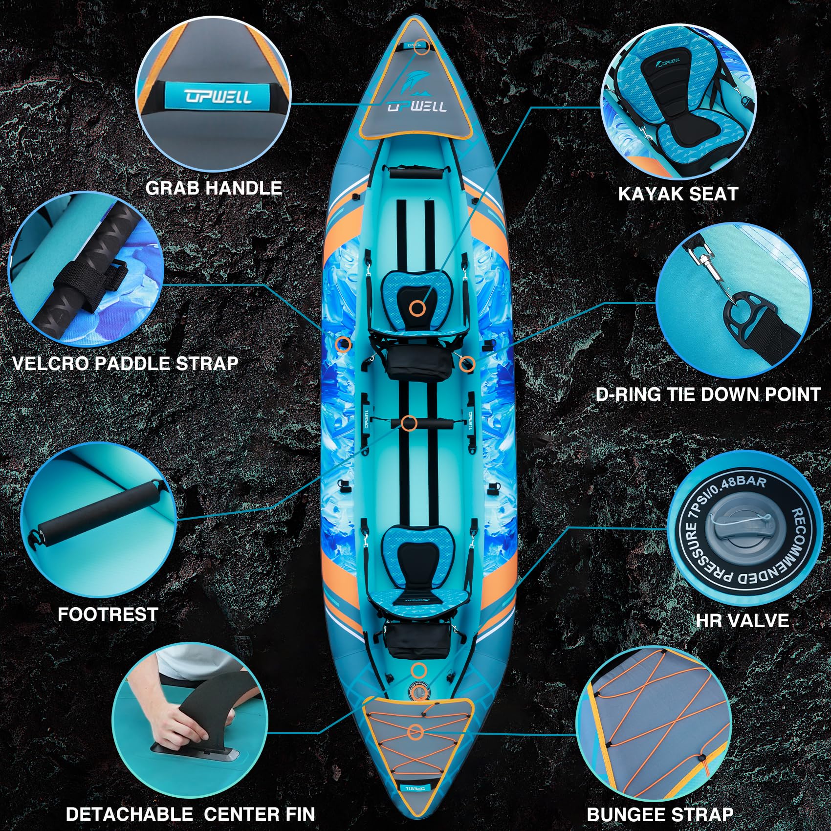 UPWELL 13'6”/11' Inflatable Recreational Kayak - 2 Person with Drop Stitch Floor and Accessories Including Kayak Seats with High Back Support, Paddle, Fin, Repair Kits, Carry Bag and Hand Pump