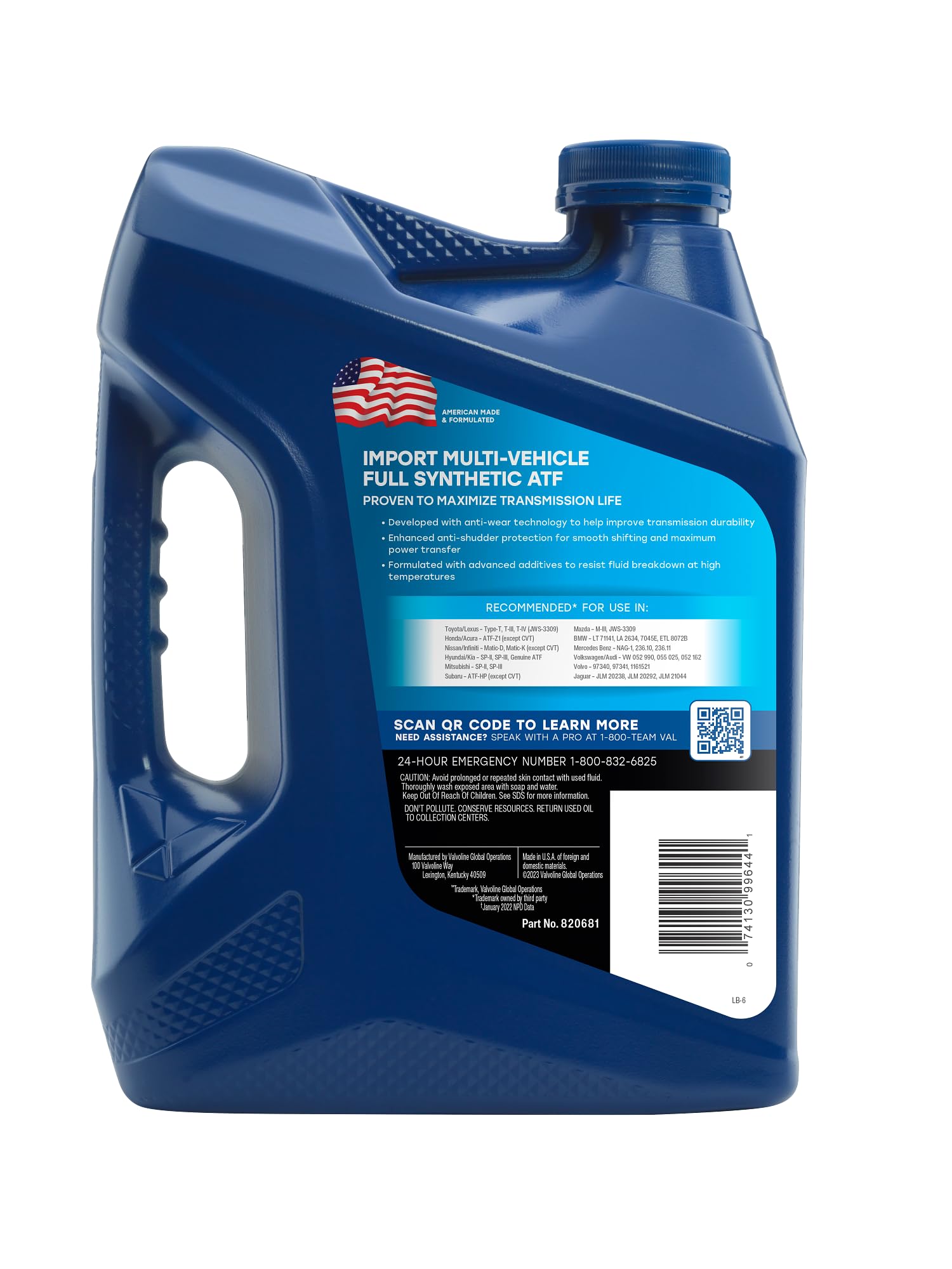 Details: Valvoline Import Multi-Vehicle ATF is the full-synthetic automatic transmission fluid that has been specially engineered to meet and exceed the requirements of most imports and domestics with automatic transmissions. Formulated with advanced additives to prevent the major causes of transmission breakdown, it’s designed to help prevent leaks, reduce wear and tear, and maximize performance – all for much longer than conventional fluids. It has improved thermal stability for longer fluid life, better viscosity stability for consistent transmission operation, and specific frictional enhancements for smooth gear engagements. Valvoline Import Multi-Vehicle ATF is suitable for a broad range of automatic transmissions including most Toyota, Honda, Nissan, Hyundai, Kia, BMW, Volvo, VW and other import and domestic vehicles. It’s specifically recommended for use in the following applications: BMW LT 71141 and ETL-7045E; Nissan/Infiniti Matic-D, Matic-K and Matic-J; Mitsubishi Diamond SP-II and SP-III; Subaru ATF-HP; Hyundai/Kia SP-II and SP-III; and Toyota/Lexus Type T. For the many shifts and miles ahead, trust your transmission with Valvoline, the #1 automatic transmission fluid brand.