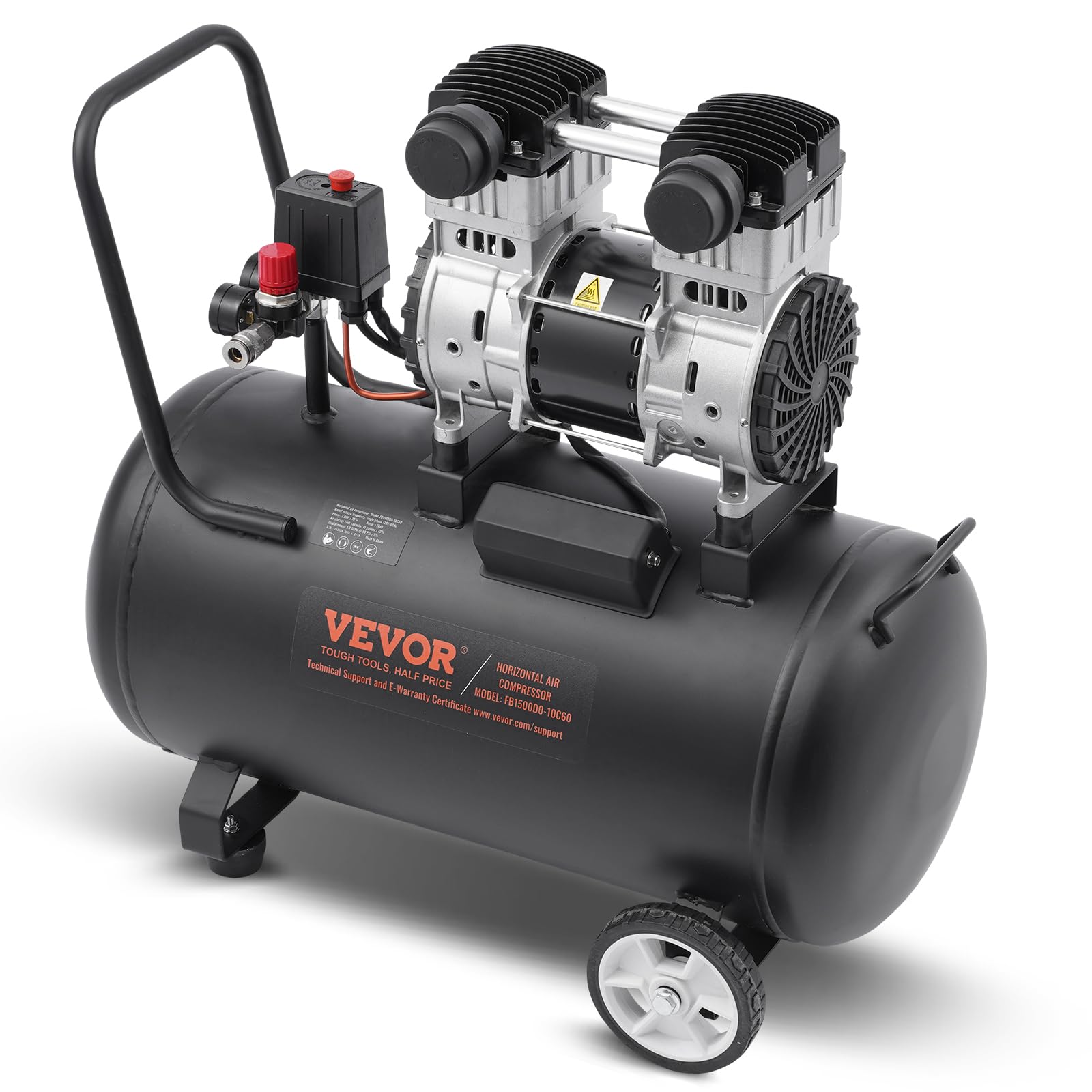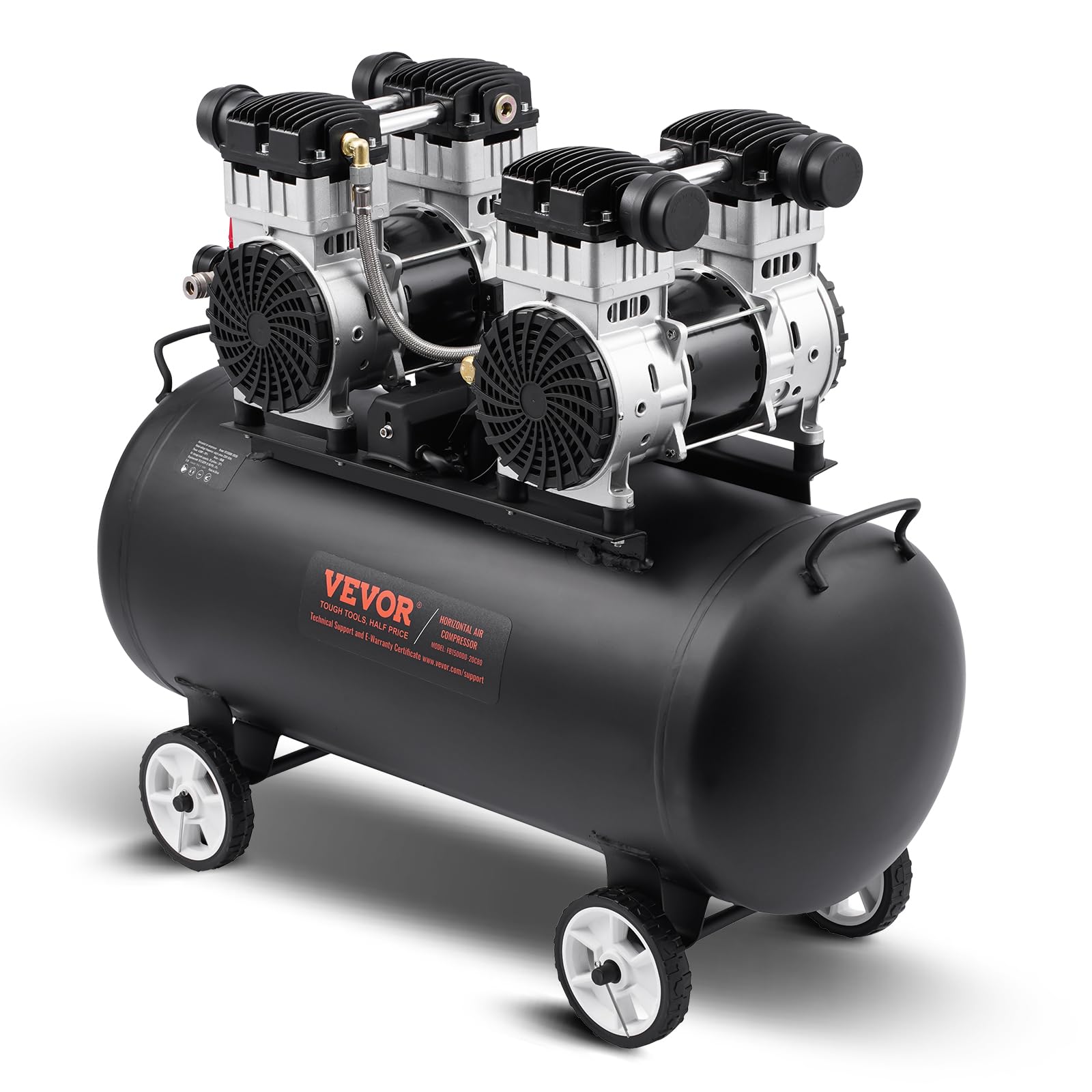 - Noise Reduction Design: The VEVOR air compressor is equipped with two high-quality silencers. Each silencer consists of a thickened muffler cover, rubber muffler pipe, and filter cotton, reducing noise while preventing fine dust from entering.