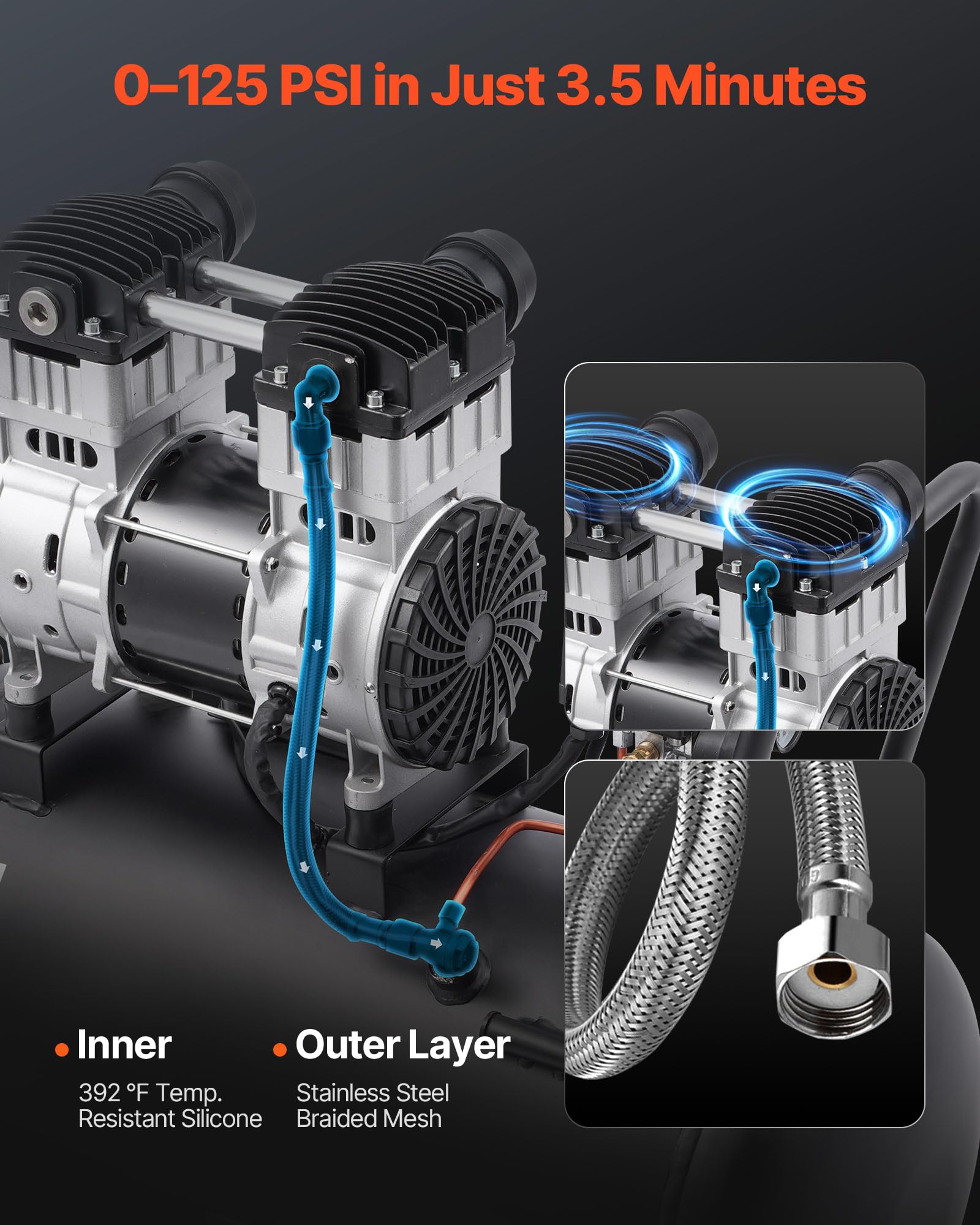- Fast and Efficient Inflation: Our oil-free air compressor adopts double tube and double cylinder intake at the same time, effectively saving time and effort. The intake pipe is made of 392 ℉ high-temperature resistant silicone and stainless steel braided mesh, with double protection to reduce damage and corrosion.