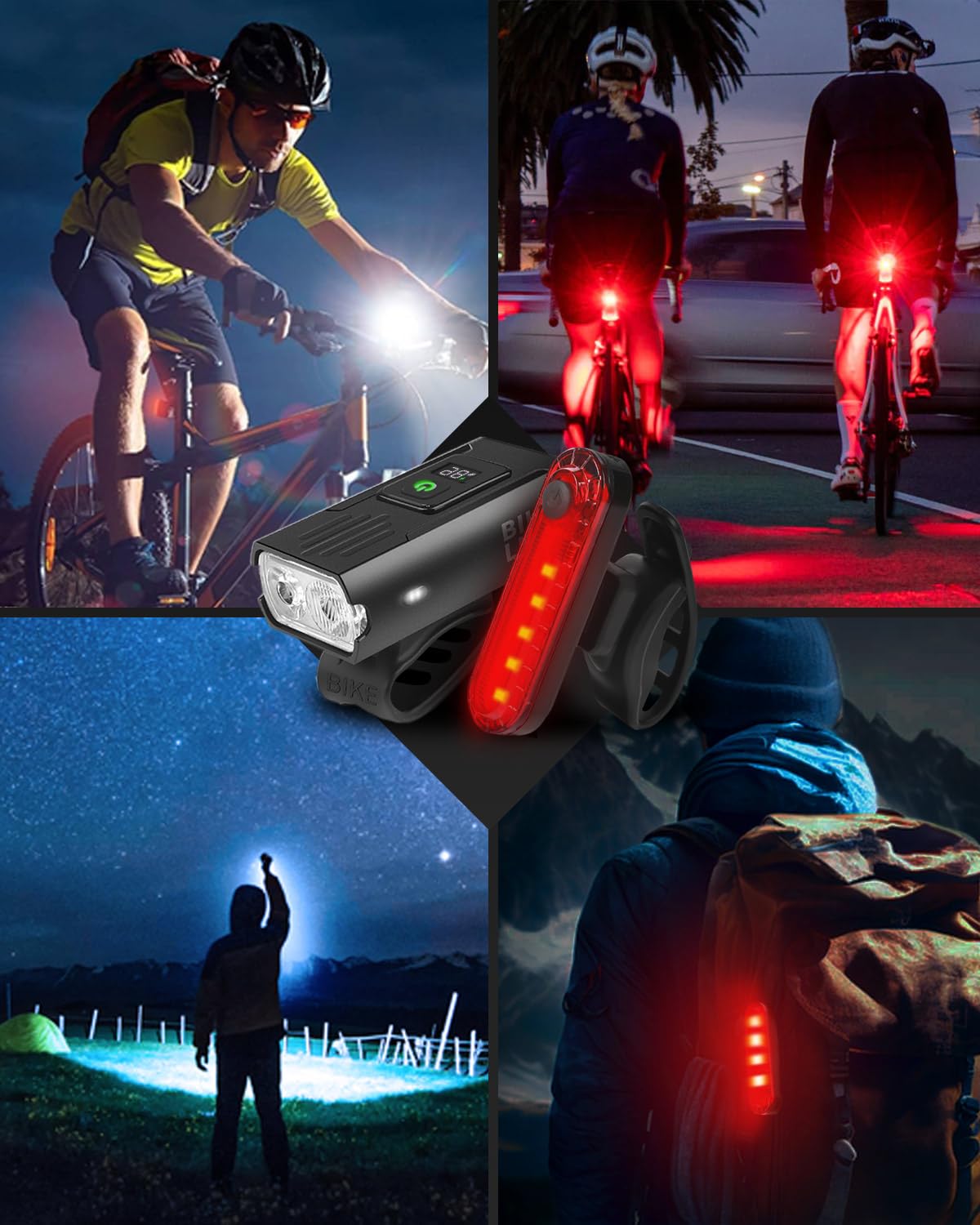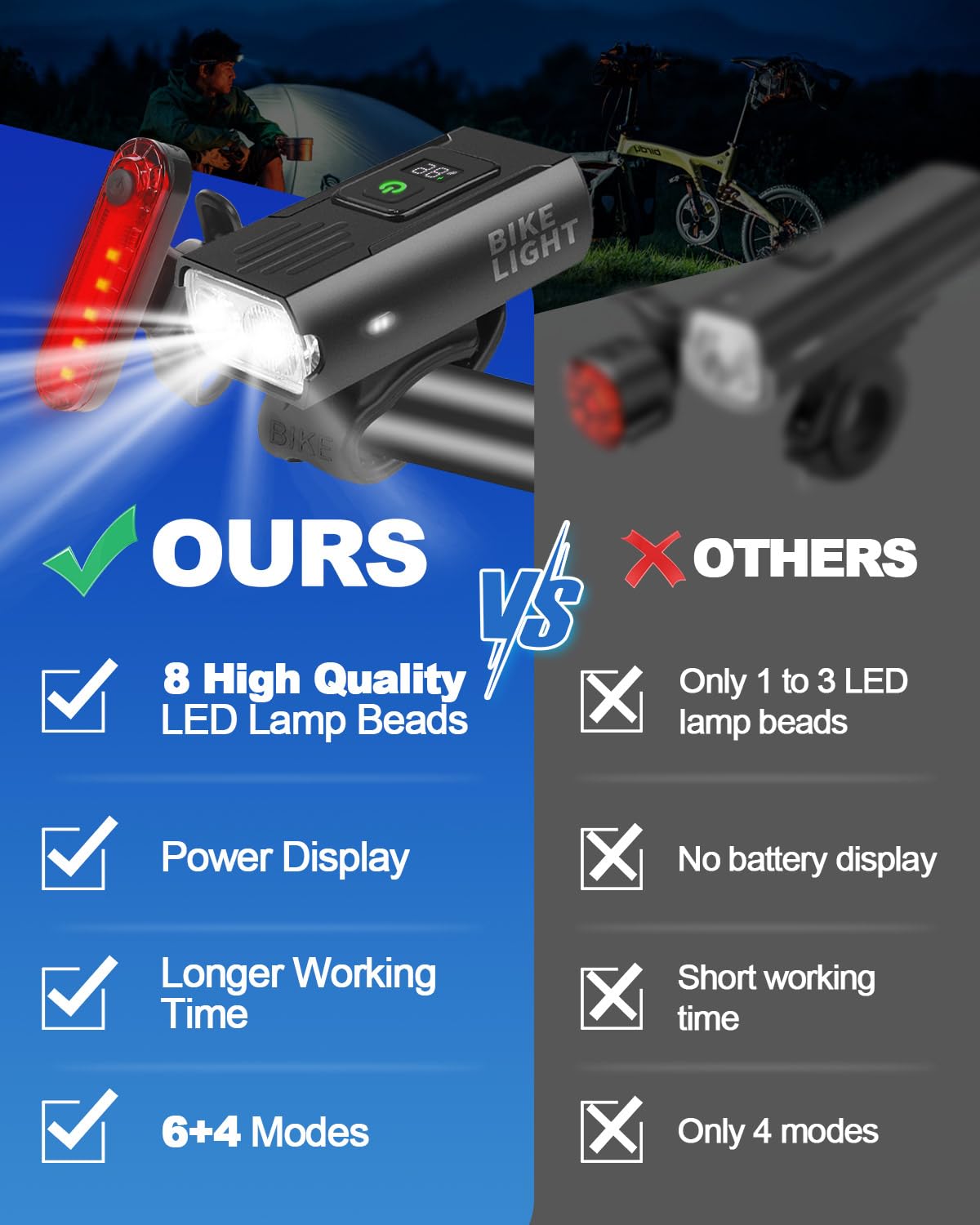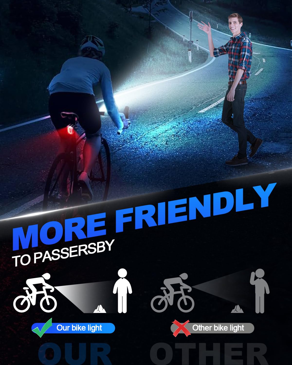- SUPER BRIGHT : Our bike safety lights for night riding with 2 LED lights high lumens bring you brightness to make everything in front of you illuminated and clear, protecting you from darkness and unknown, ensuring the safety of you and your family.