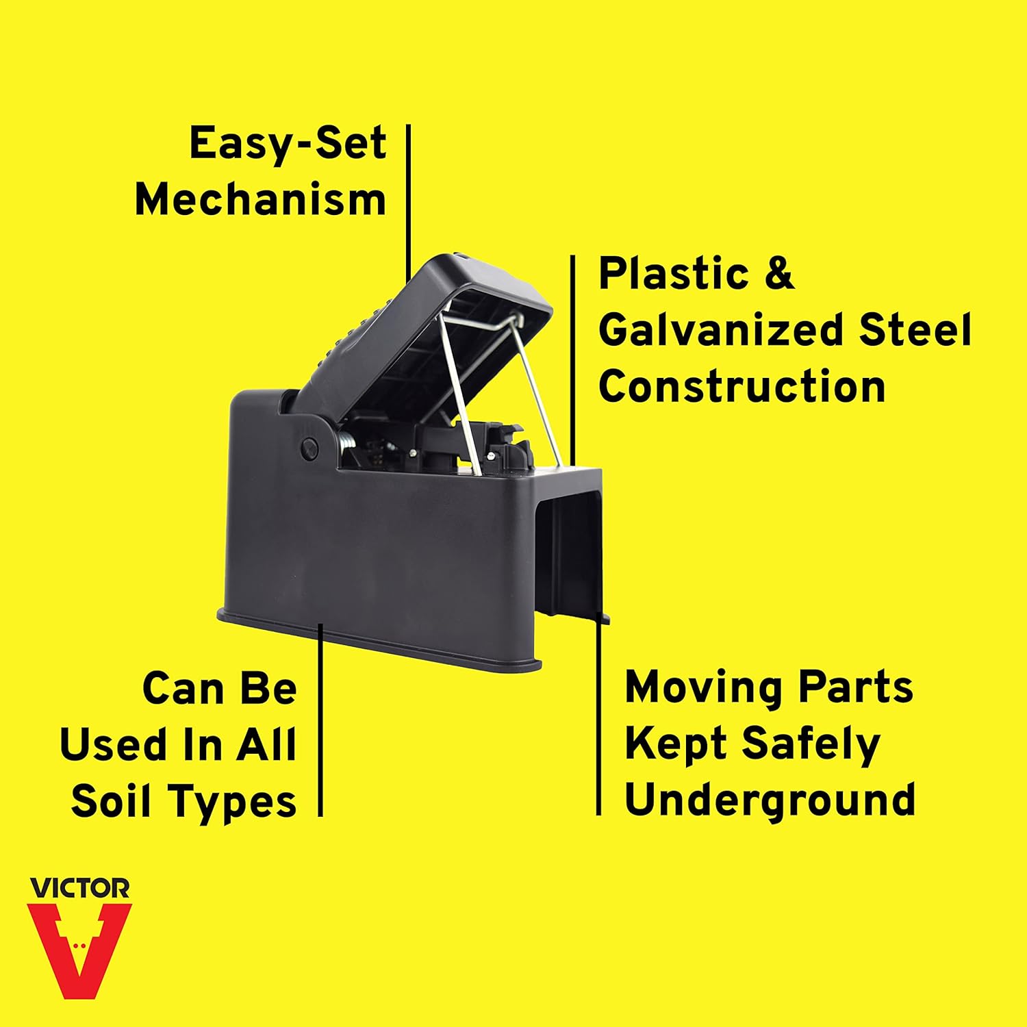 Gopher holes popping up is probably one of the last sights you want to see in your yard. With the Victor the Black Box Gopher Trap, you can be prepared when the worst happens. This convenient choker loop-style trap quickly and effectively kills nuisance gophers before they can continue wreaking havoc on your property. For your convenience, the trap comes ready-to use and features an easy-set design that you can activate with just one click! Once the trap is in place near the gopher activity, simply step down on the set lever until you hear it click. The Black Box Gopher Trap is constructed of weather-resistant plastic and galvanized steel to offer superior durability for use in the outdoors. To offer peace of mind, when installed properly inside a gopher tunnel, all the traps moving parts are located safely below ground away from children and pets. It’s a great alternative to chemical and poisons. When used correctly, traps can produce a catch within 48 hours. It is best to move the trap to another location in the runway if you do not catch a gopher in this timeframe.