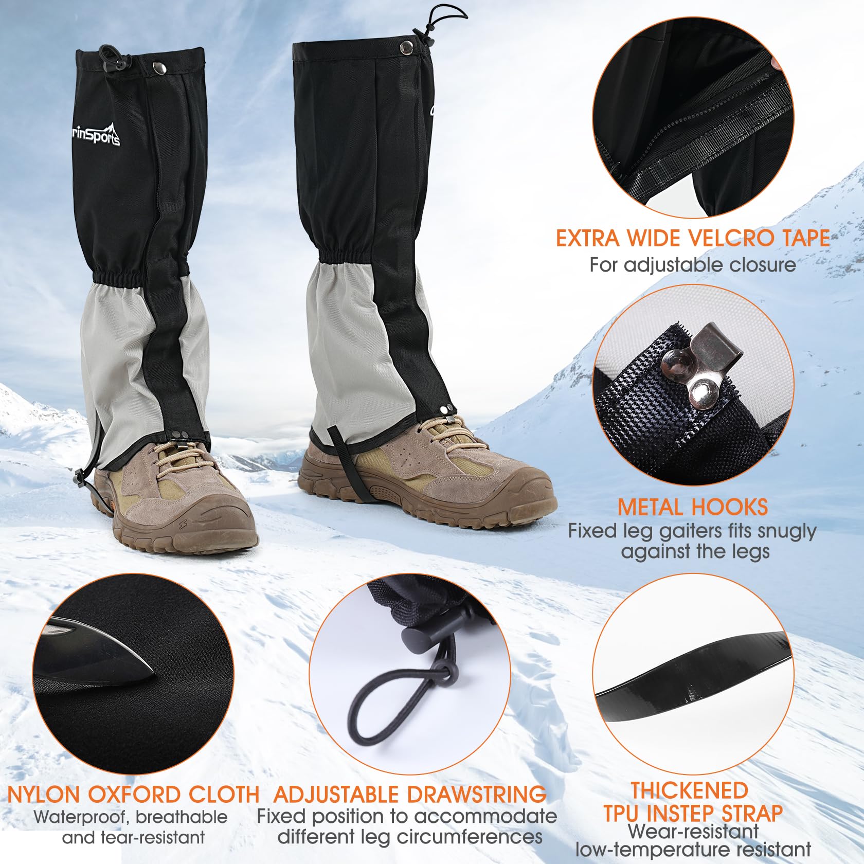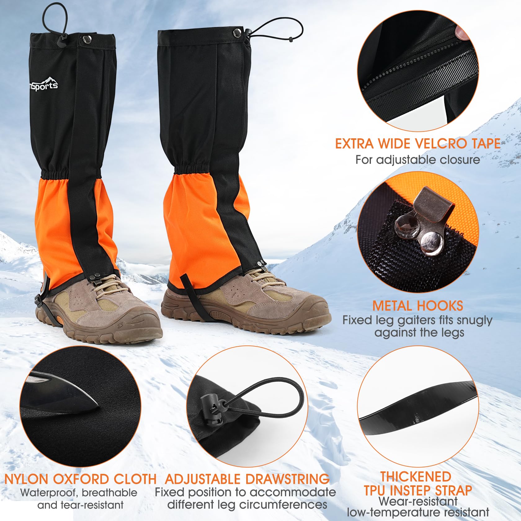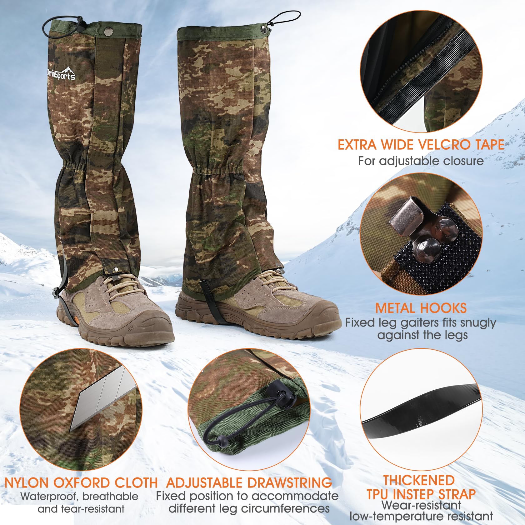 - Equipped with professional-grade TPU straps, our hunting gaiters resist both low and high temperatures. Reinforced stitching enhances durability, Enjoy reliable performance without worrying about wear and tear during your outdoor adventures