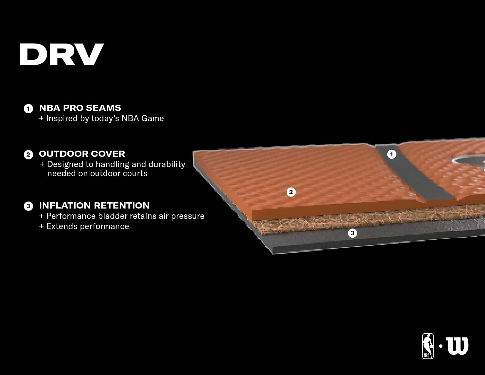 Details: Inspired by the drive that lives inside every NBA hopeful. The Wilson NBA DRV Basketball is designed for outdoor play and built to stand up to the elements. Inflation retention lining creates longer lasting air retention with this ball designed for ultimate outdoor durability.