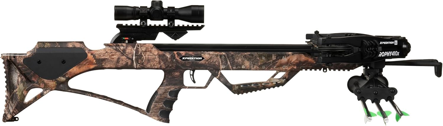 Xpedition Archery Trophy 410X Crossbow with Crank Cocking Device, Compound Crossbow Package, Illuminated 4X32 Scope, 6 20" Bolts, 410 Feet Per Second