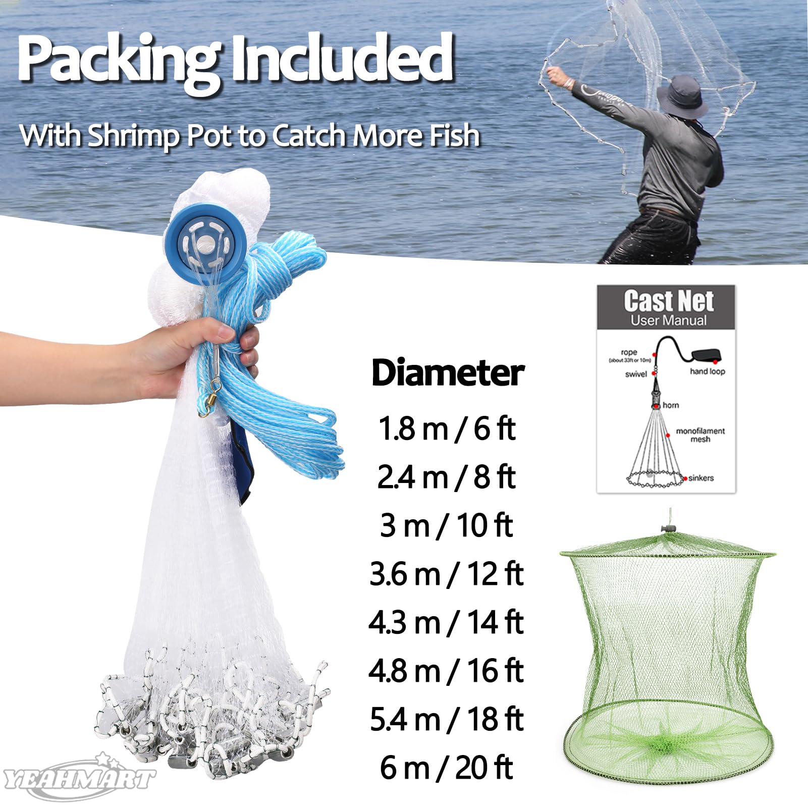 - EASY OPERATION: This design makes cast nets easier to throw fishing nets, even if you are a novice, you can easily learn to catch more live bait. Make capturing easy and fun. Provides significant savings in bait cost. It can meet the needs of professional fishing enthusiasts, so come and choose our fishing net as a Christmas, New Year, holidays, or birthday gifts for friends and family.