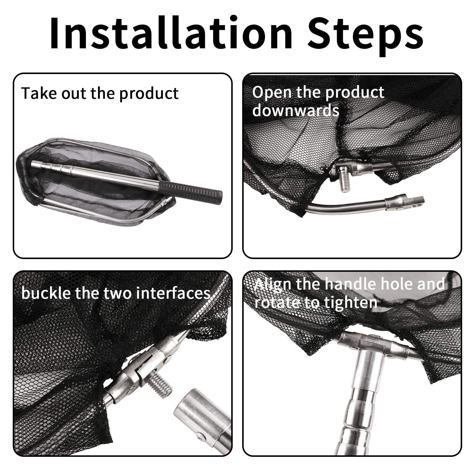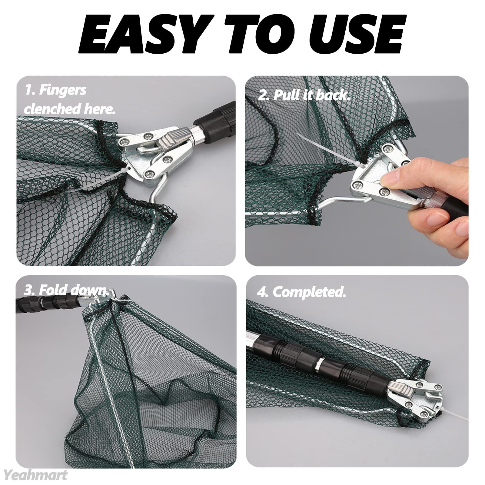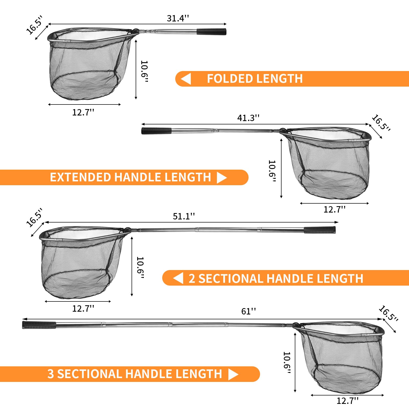 - Easy to Operate: The landing net is specially designed with a rotary switch for easy locking and fastening. You can adjust the pole to a suitable length with ease, and the net's 0.46 lbs weight and foldable design make it compact for transportation and storage.