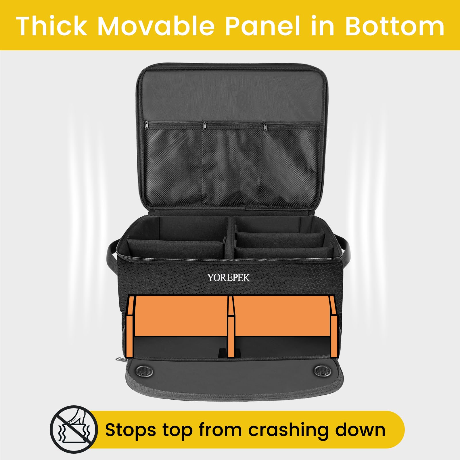 - SEPARATE STORAGE FOR 2 SHOES: YOREPEK golf trunk organizer for car is upgraded on storage compartments, having separate shoes compartment on the bottom layer, to store 2 pairs of shoes up to size 11; The bottom compartment is with ventilated holes to keep air flowing around shoes; And the bottom storage space is made of polyester, which is easy to clean
